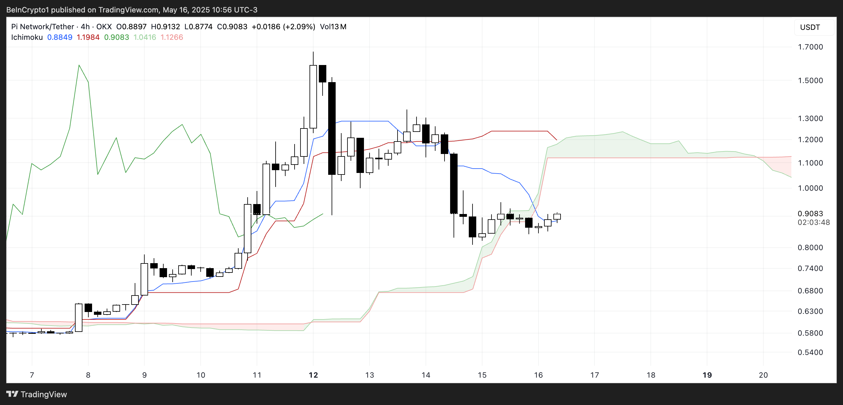 O gráfico Ichimoku Cloud para Pi Network mostra sinais de fraqueza contínua após uma queda acentuada. A ação do preço está abaixo do Kijun-sen (linha vermelha) e próxima ao Tenkan-sen (linha azul), indicando que o impulso de curto prazo permanece pessimista.