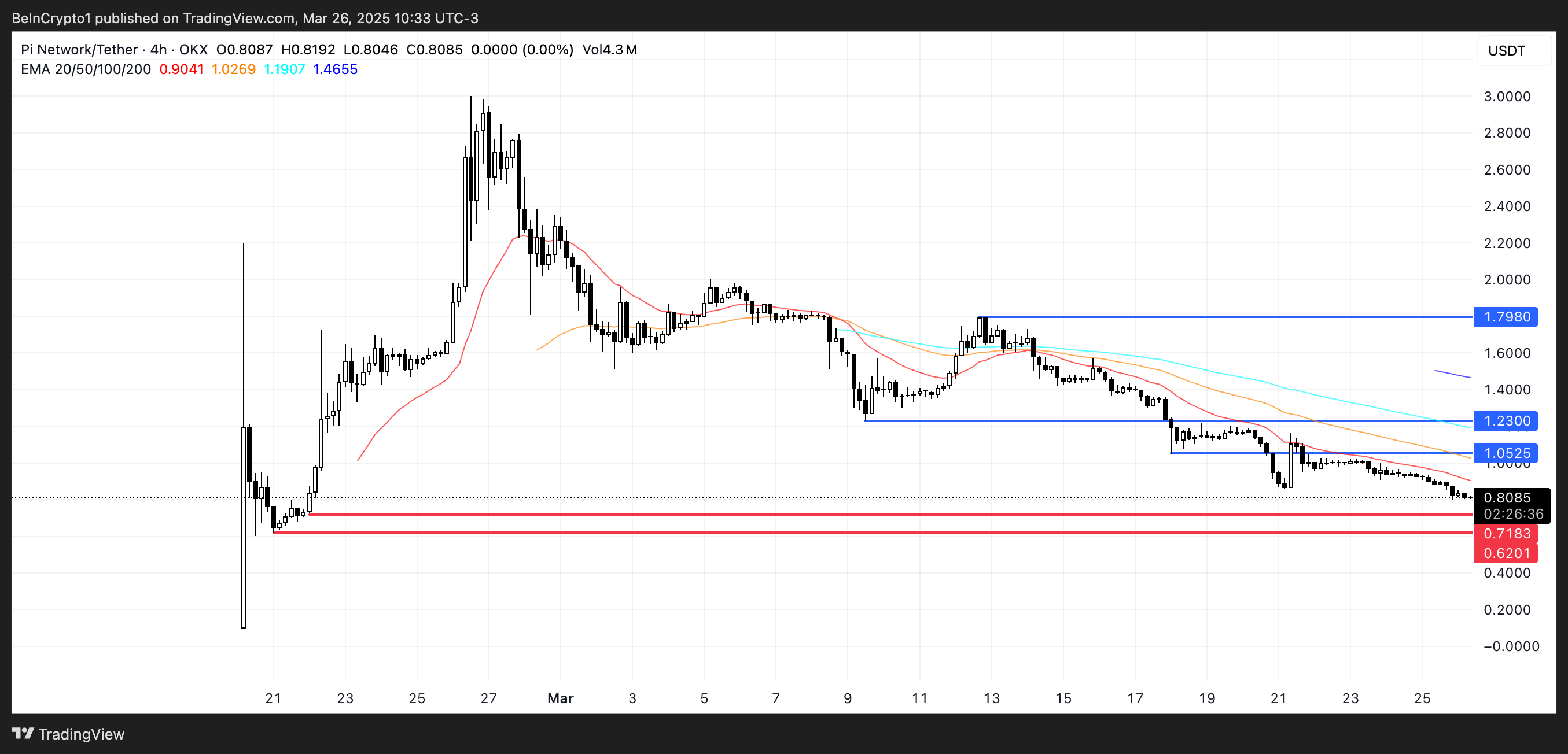 O gráfico de preço da Pi Network mostra um nível de suporte crítico em US$ 0,718, que tem sustentado o valor nas sessões recentes.