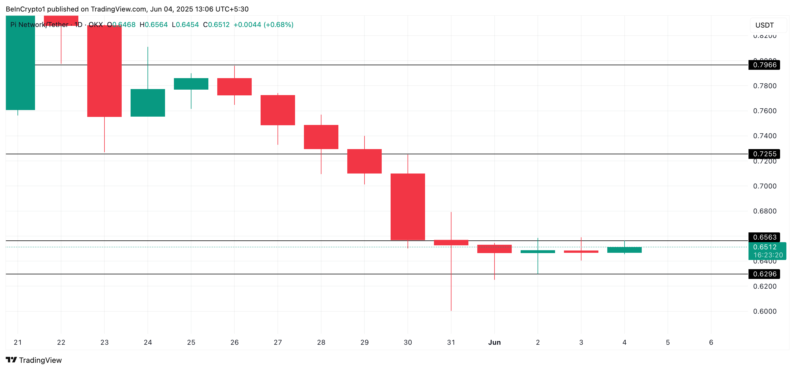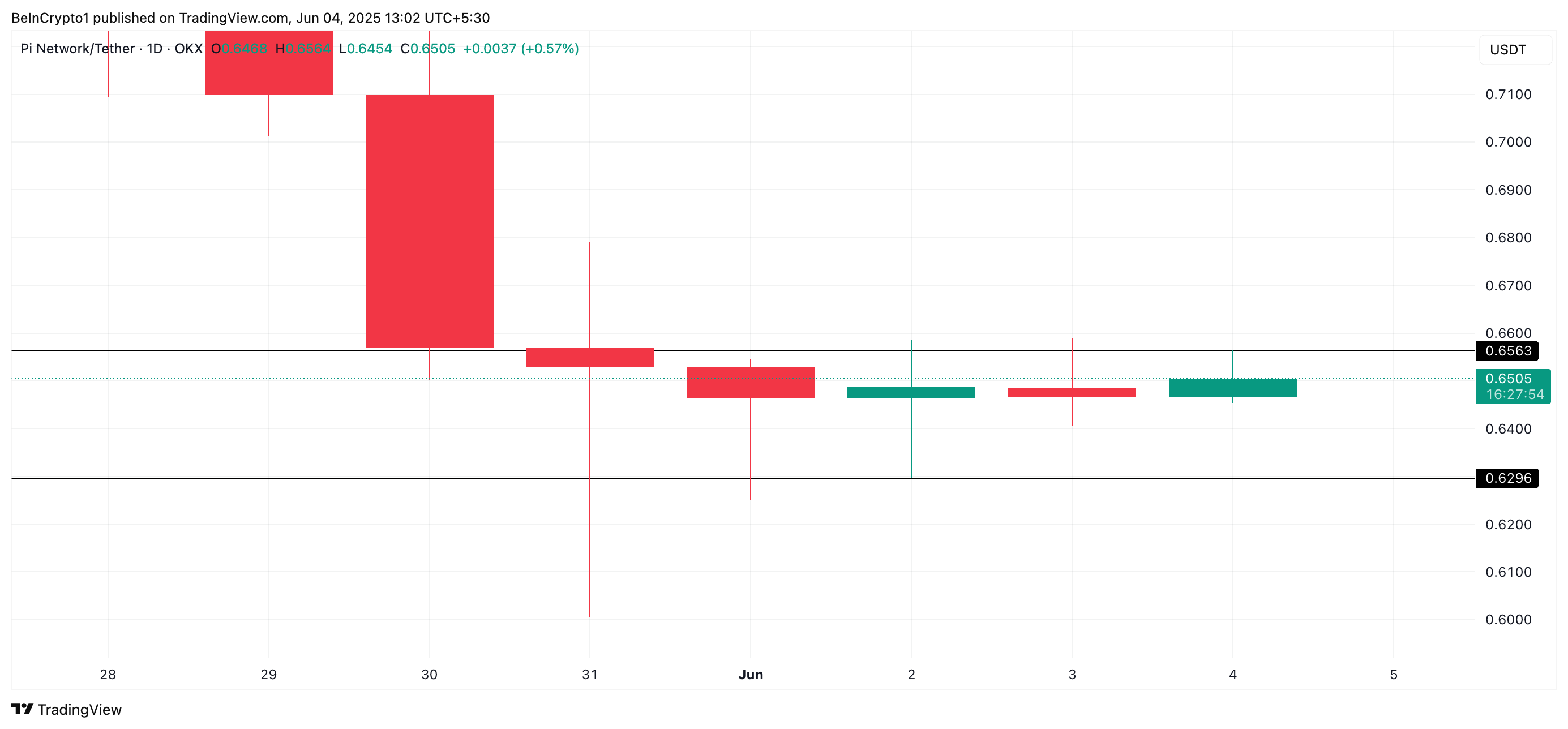 No gráfico diário PI/USD, observa-se que a altcoin permanece contida em um intervalo atipicamente restrito entre US$ 0,629 e US$ 0,656 desde 31 de maio.