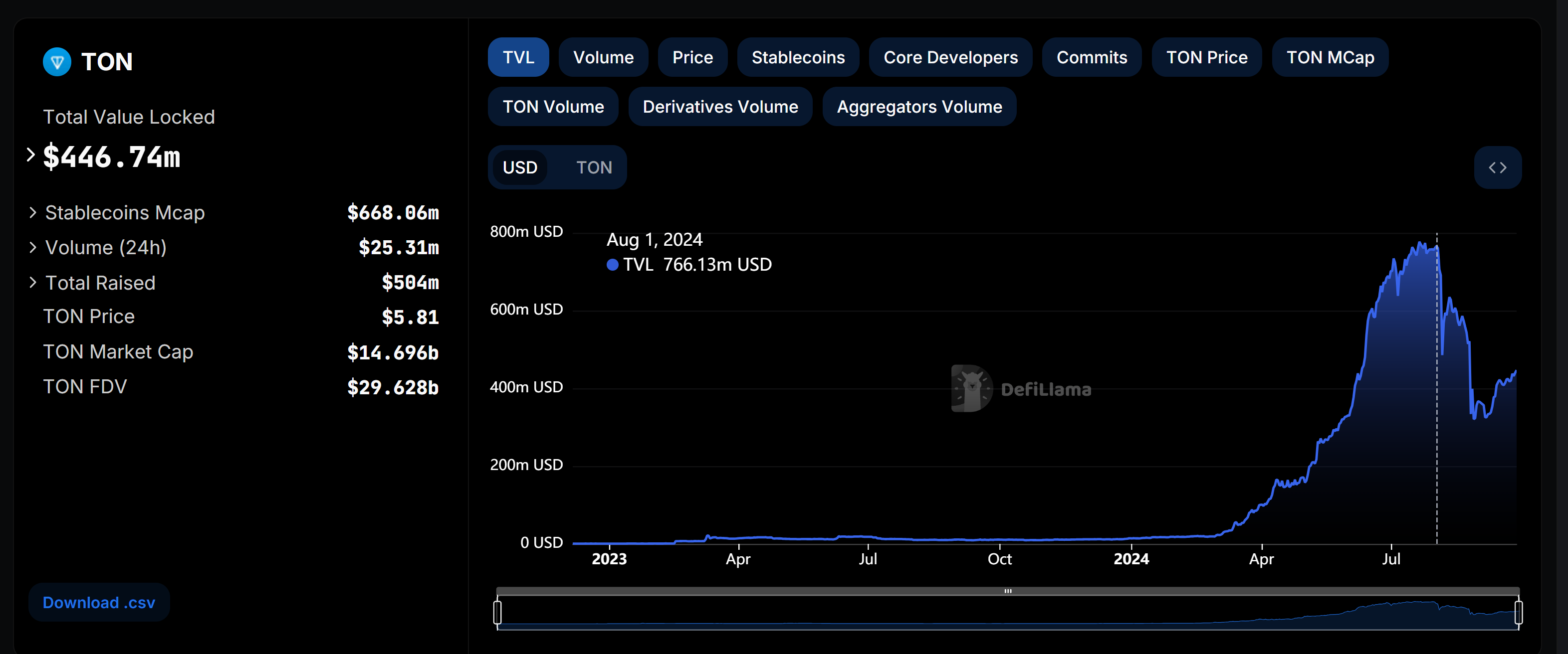 Essas preocupações também levaram a uma queda no valor total bloqueado (TVL) da TON, que caiu quase 42%. Segundo dados da DefiLlama, ele caiu de US$ 766,13 milhões em 1º de agosto para US$ 446,74 milhões no momento da redação.