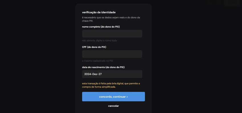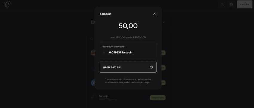4- Após definir a memecoin e o valor, clique ‘comprar com pix’ e preencha os dados;