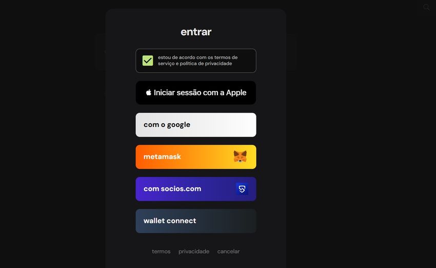 2- Faça o login, com sua conta do Google ou com uma carteira de criptomoedas, caso você possua;