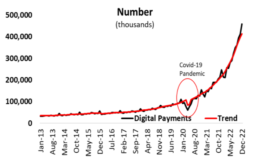 No entanto, o apetite por incorporar pagamentos digitais aumentou significativamente. A pandemia global e as inovações do varejo médio desencadearam a mudança e, desde então, o uso de pagamentos digitais no Peru quintuplicou. Os Indicadores de Pagamentos Digitais abaixo retratam um aumento no valor e número de tais pagamentos.