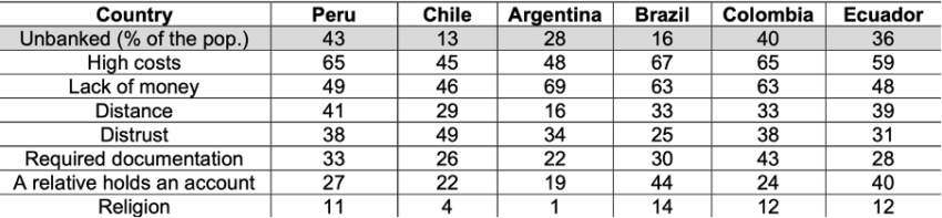 O Peru enfrenta desafios significativos para alcançar a inclusão financeira, com a maioria de sua população desbancarizada. Existem várias razões pelas quais a maior parte da população se enquadra nessa categoria.
