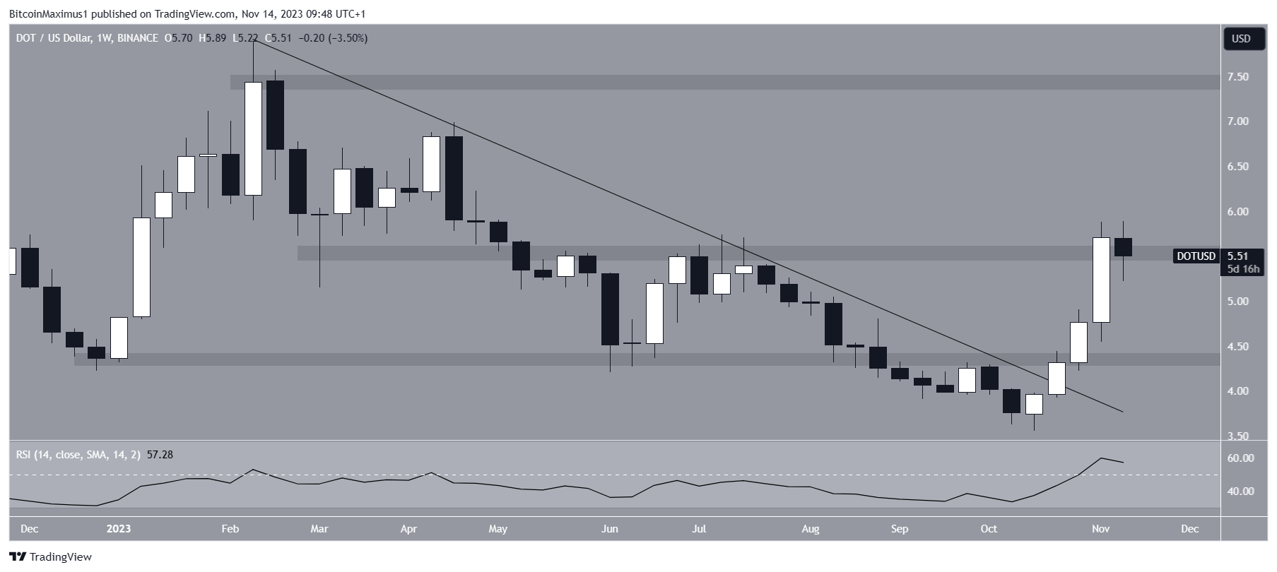 O preço da Polkadot (DOT) aumentou por quatro semanas consecutivas, culminando com um topo de US$ 5,90.