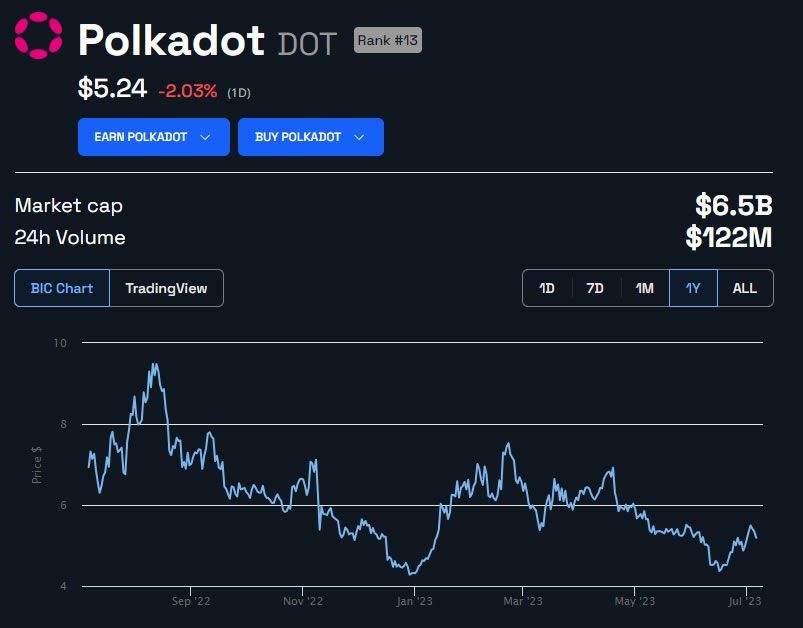 Atualmente, a DOT está lutando para ultrapassar o nível de US$ 6, com queda de 2% nas últimas 24 horas para US$ 5,24.