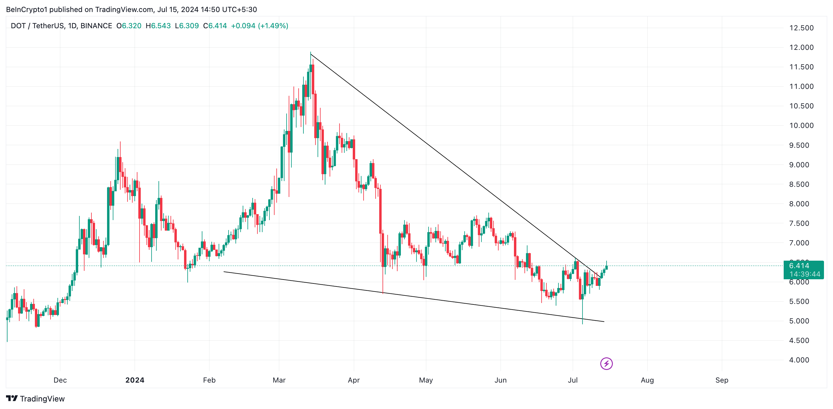 A alta dos preços da Polkadot (DOT) na última semana fez com que ela saísse do padrão de cunha descendente no qual tem se mantido desde março.