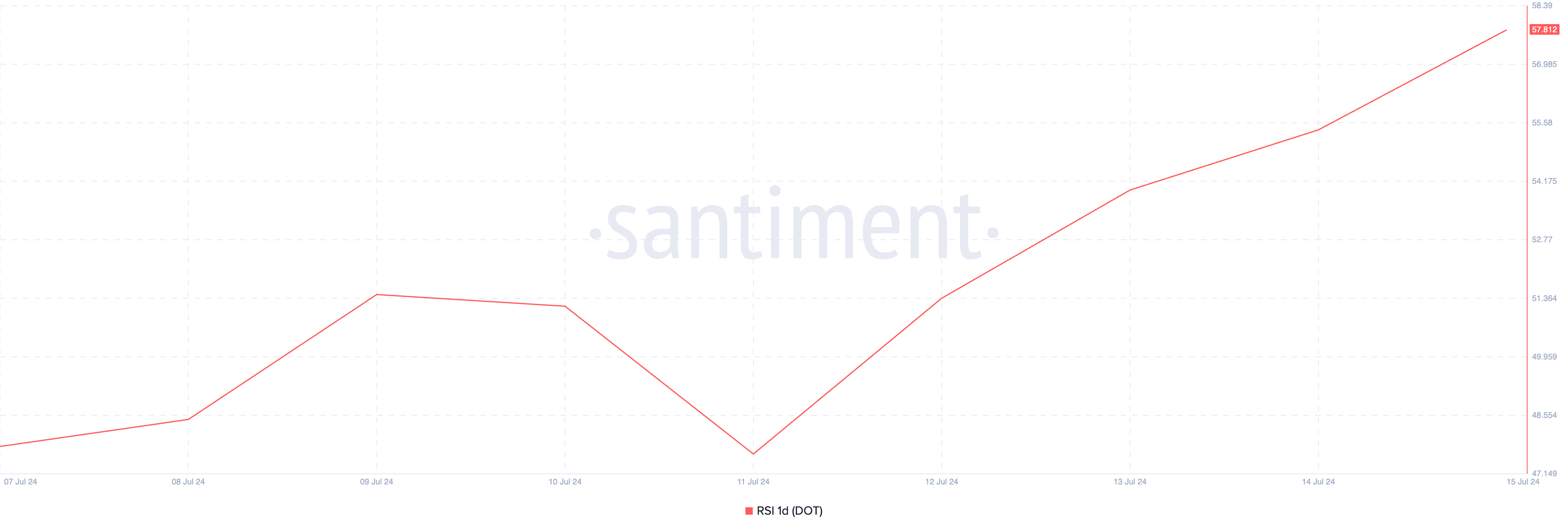 Em 57,81, o RSI crescente do DOT sinaliza um aumento constante na atividade de compra.