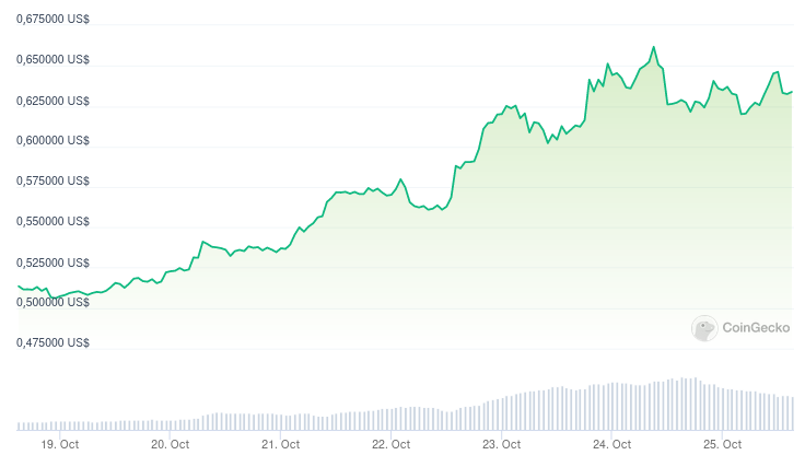 O ativo atingiu uma alta de US$ 0,646 após o anúncio da Polygon Labs. Desde então, recuou ligeiramente e está negociado a US$ 0,633, de acordo com dados da CoinGecko.