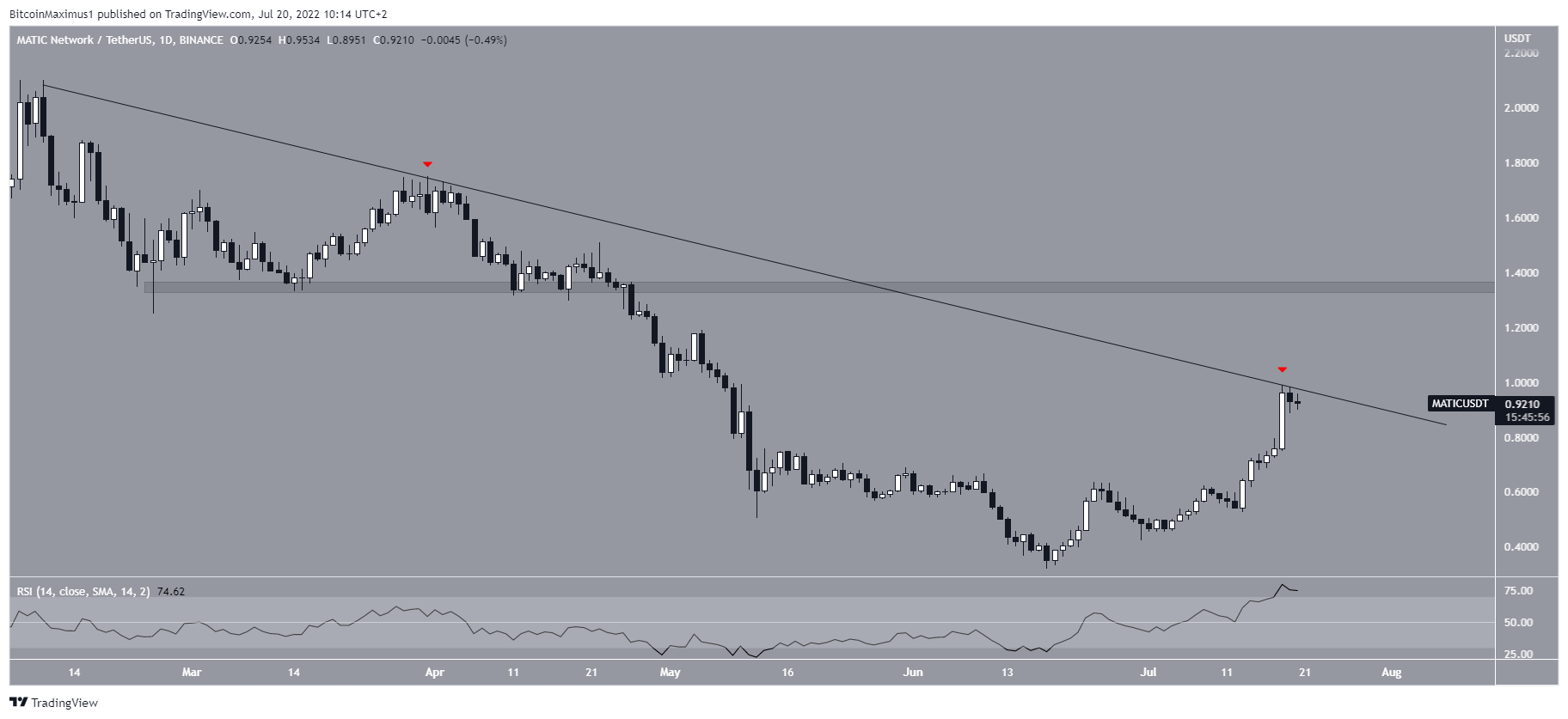 A Polygon (MATIC) saiu de uma linha de resistência descendente de longo prazo. É provável que retome seu movimento ascendente assim que conseguir romper a atual resistência de curto prazo.
