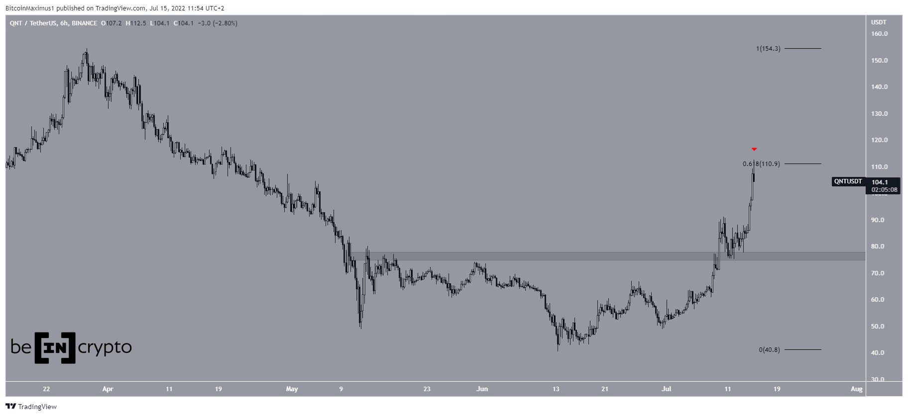 O QNT está subindo desde que caiu para um mínimo de US$ 40 em 14 de junho. Até agora, o movimento ascendente levou a uma alta de US$ 112,50 em 15 de julho. A alta foi feita exatamente no nível de resistência de retração de 0,618 de Fibonacci, que por sua vez causou uma rejeição (ícone vermelho).