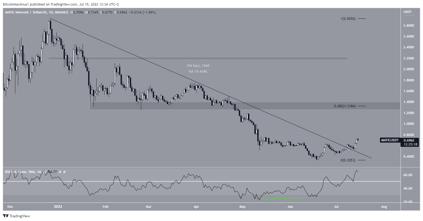 A MATIC está caindo abaixo de uma linha de resistência descendente desde que atingiu um preço recorde de US$ 2,92 em dezembro de 2021. O movimento descendente levou a uma baixa de US$ 0,316 em 18 de junho.