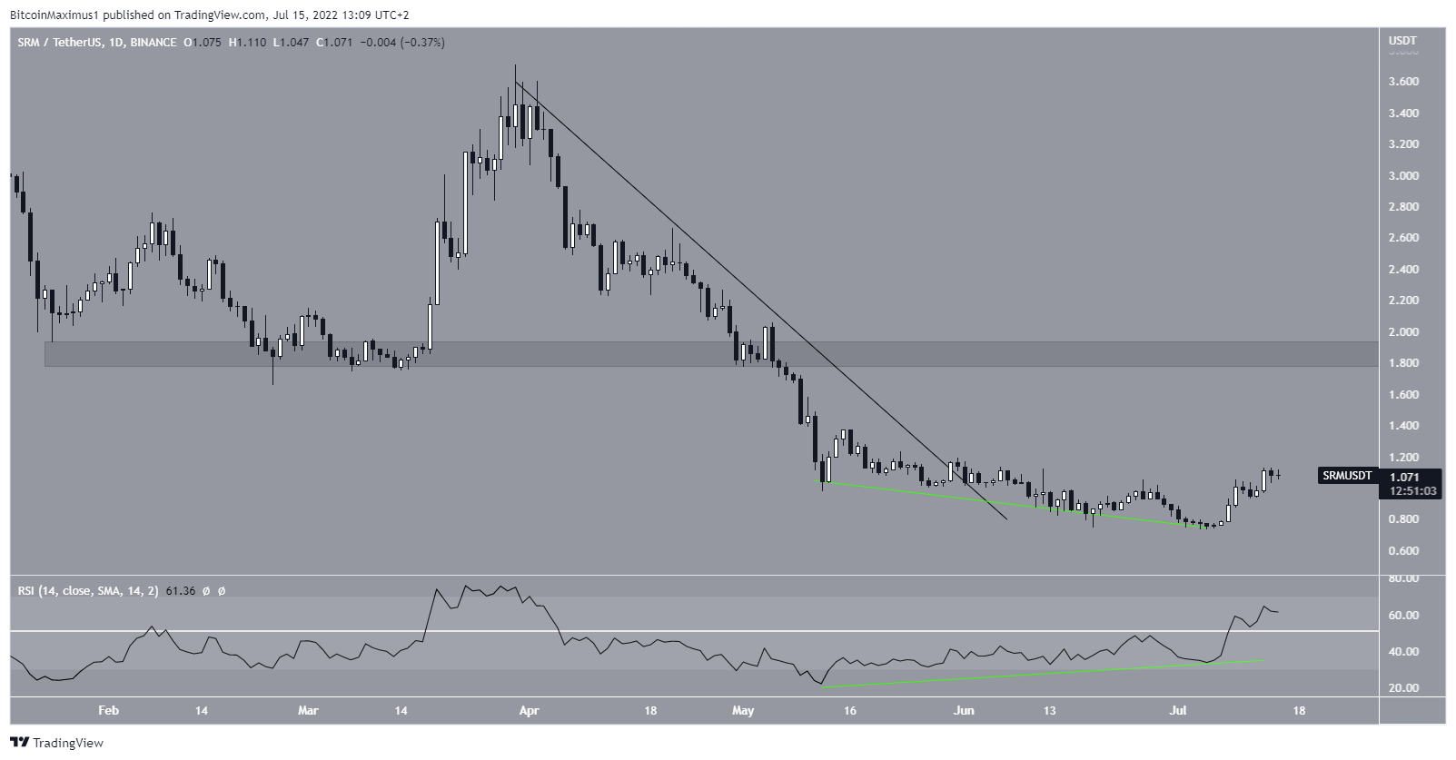 SponsoredApesar dessa falta de força, o RSI diário continuou gerando divergência de alta (linha verde), finalmente iniciando um movimento ascendente em 2 de julho. Até agora, o SRM atingiu uma alta de US$ 1,09.