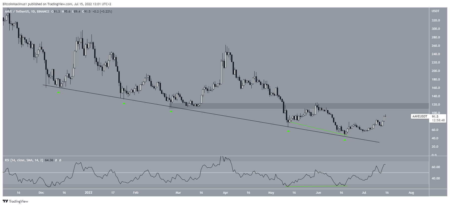 A AAVE vem caindo ao lado de uma linha de suporte descendente desde dezembro de 2021. O movimento descendente até agora levou a uma mínima de US$ 45,6 em 18 de junho.