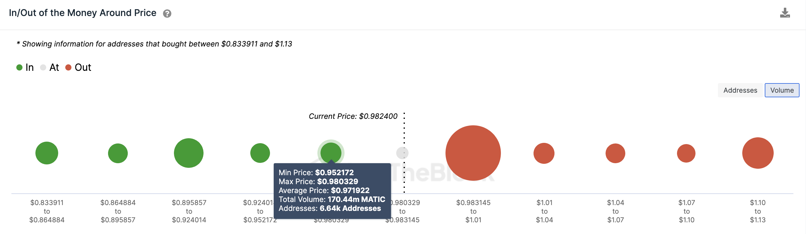 A MATIC parece estar prestes a cair abaixo de US$ 0,95, de acordo com os dados In/Out of Money Around Price (IOMAP) compilados pelo IntoTheBlock. No entanto, os 6.000 endereços que compraram 170 milhões de moedas por um preço mínimo de US$ 0,95 tentariam impedir a queda.