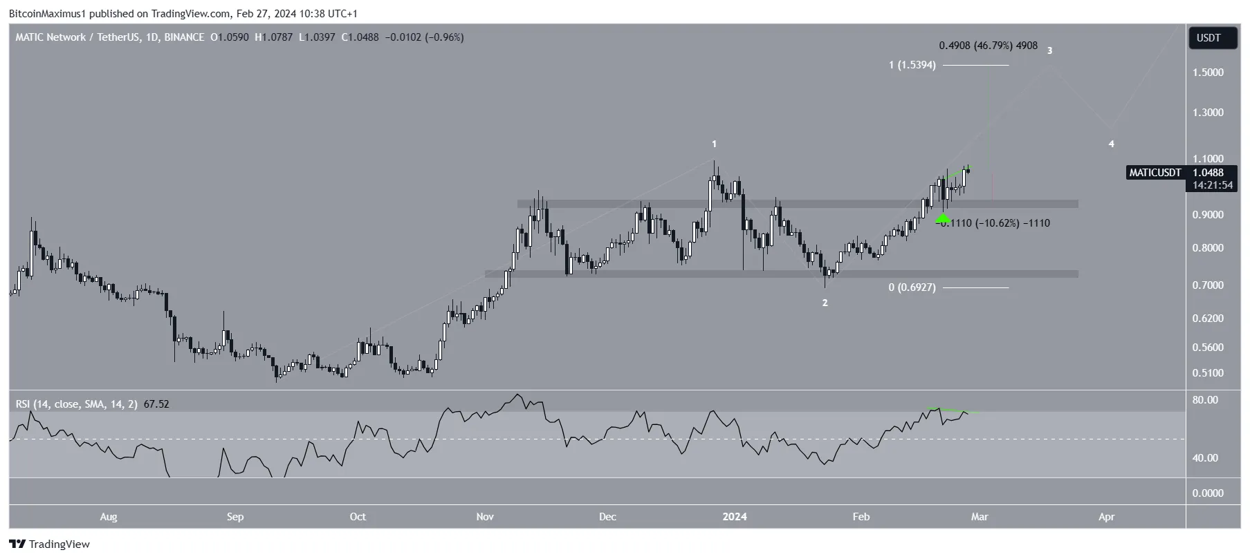 Assim como o gráfico semanal, o diário também fornece uma leitura otimista por causa da ação do preço e da contagem de ondas. A ação de preço mostra que a MATIC rompeu a área horizontal de US$ 0,95 e a validou como suporte (ícone verde) em 21 de fevereiro.