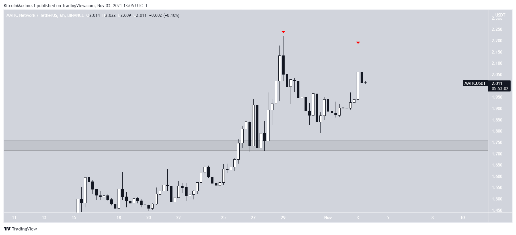 A MATIC está em tendência de alta desde 21 de setembro. No dia 27 de outubro, ela rompeu a área de resistência de US$ 1,74 e subiu significativamente no dia seguinte.
