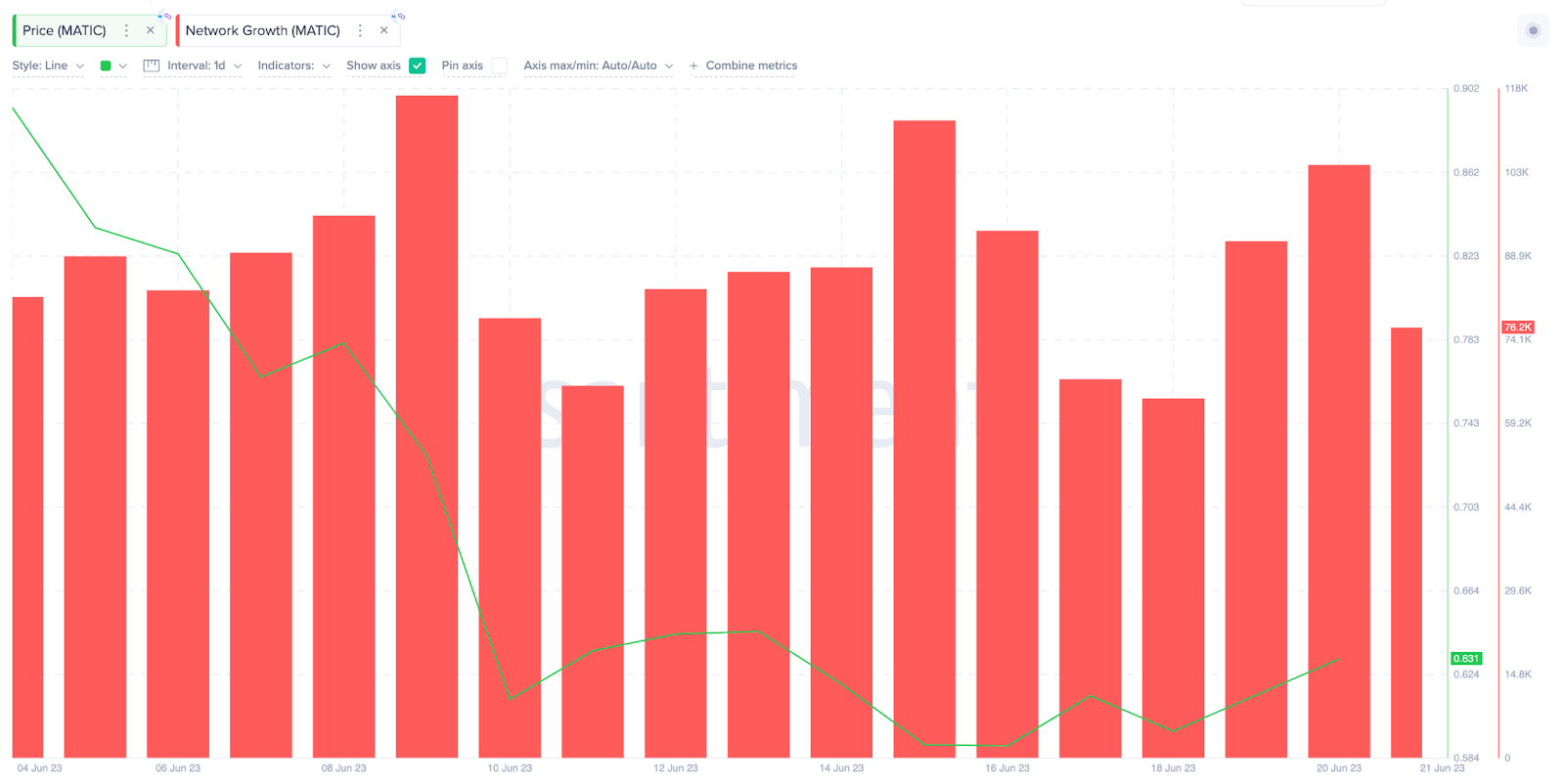 Apesar da recente retração de preço de 35% que levou a MATIC ao fundo do poço em 2023, a rede Polygon continuou a adquirir novos usuários. O gráfico da Santiment abaixo ilustra que a blockchain manteve um crescimento saudável desde o crash de 5 de junho.