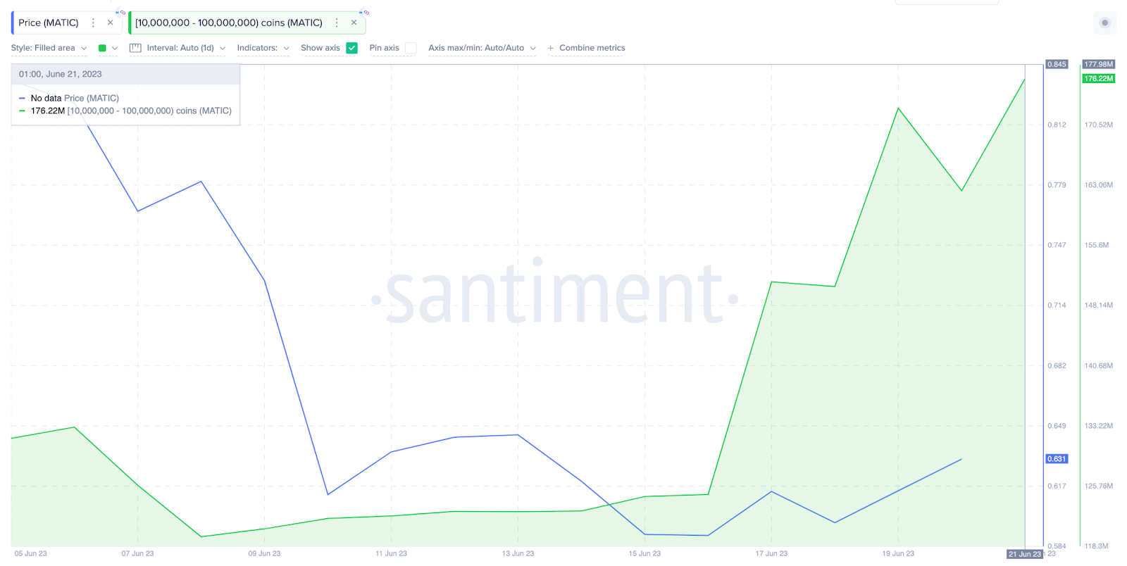 O gráfico da Santiment abaixo mostra como as baleias com 10 milhões a 100 milhões de moedas MATIC aumentaram suas participações esta semana. Entre 15 e 22 de junho, as baleias compraram 52 milhões de moedas no valor de aproximadamente US$ 36,4 milhões.