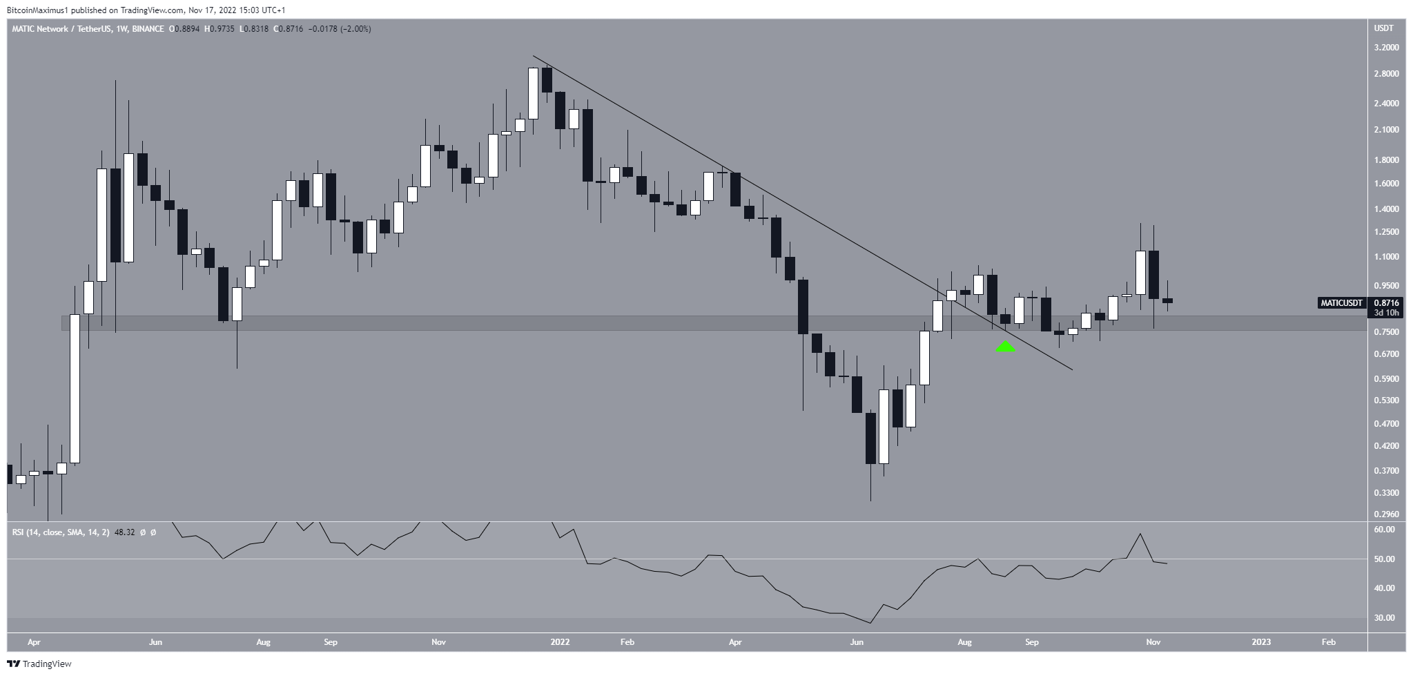 O preço da MATIC validou a linha/área como suporte em agosto (ícone verde) e vem subindo desde então. Ele voltou para a área de US$ 0,80 mais uma vez em novembro. Atualmente, o RSI semanal está neutro, ficando em 50.