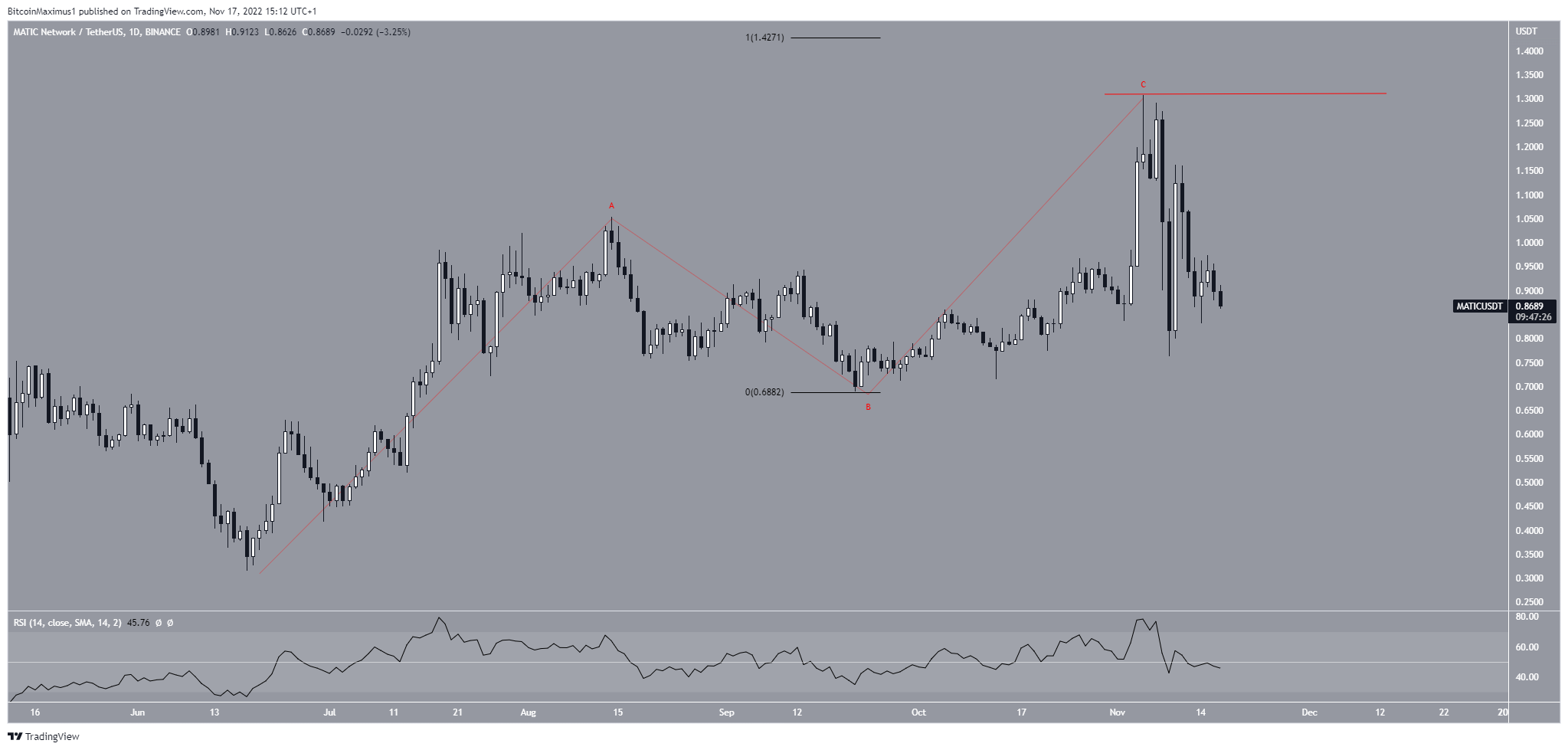 Já a contagem de baixa sugere que a MATIC completou uma estrutura corretiva A-B-C. Nela, as ondas A:C tiveram uma proporção ligeiramente inferior a 1:1. Se correto, isso significaria que o preço cairia para uma nova mínima anual. Essa contagem seria invalidada com um movimento acima do topo da onda C em US$ 1,30 (linha vermelha).