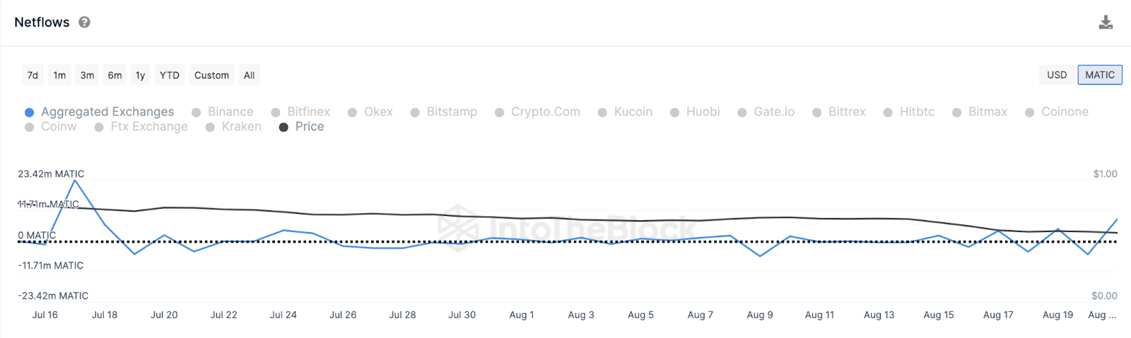 Em mais uma confirmação da perspectiva de baixa, os detentores parecem estar se preparando para mais ações de venda nos próximos dias. Conforme mostrado abaixo, os depósitos de MATIC nas exchanges excederam os saques em 8,41 milhões de tokens em 21 de agosto.