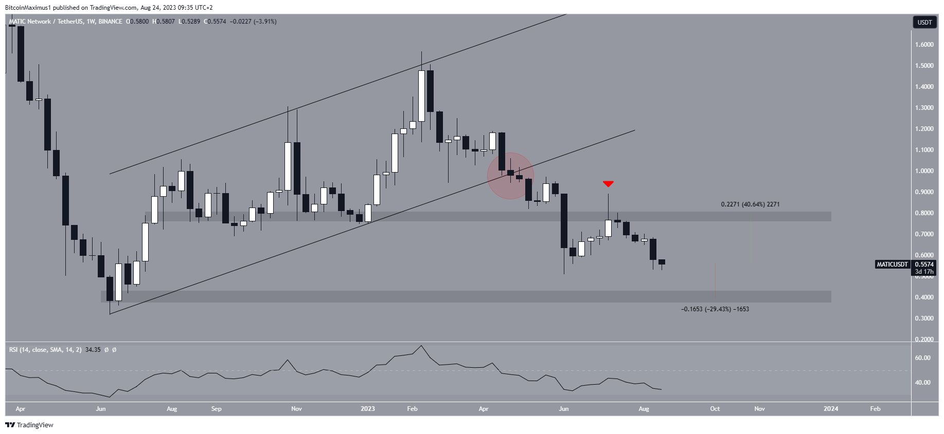 A análise técnica para o período semanal mostra uma perspectiva de baixa para a MATIC. A principal razão para isso é a quebra de um canal paralelo ascendente em abril (círculo vermelho).