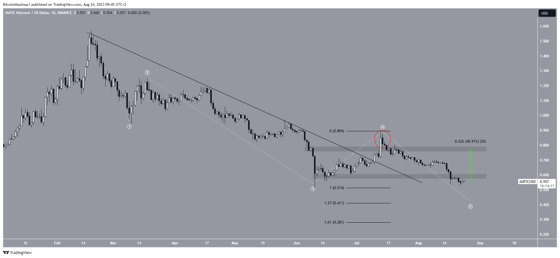A segunda razão é a contagem de ondas. A contagem mais provável sugere que a MATIC iniciou um movimento descendente de cinco ondas (branco) em fevereiro.