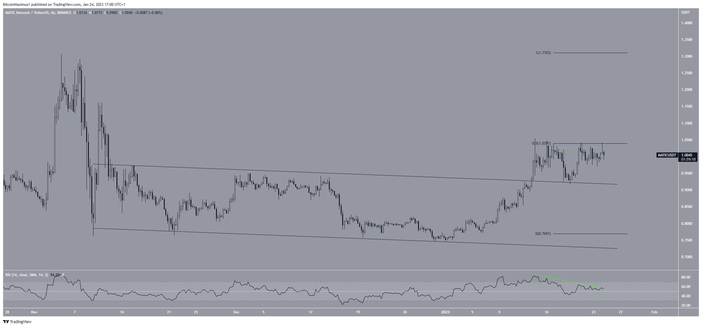A Polygon (MATIC) saiu de um canal de curto prazo, mas não conseguiu ultrapassar a área de resistência de US$ 1,04. Romper a resistência é crucial para manter a tendência.
