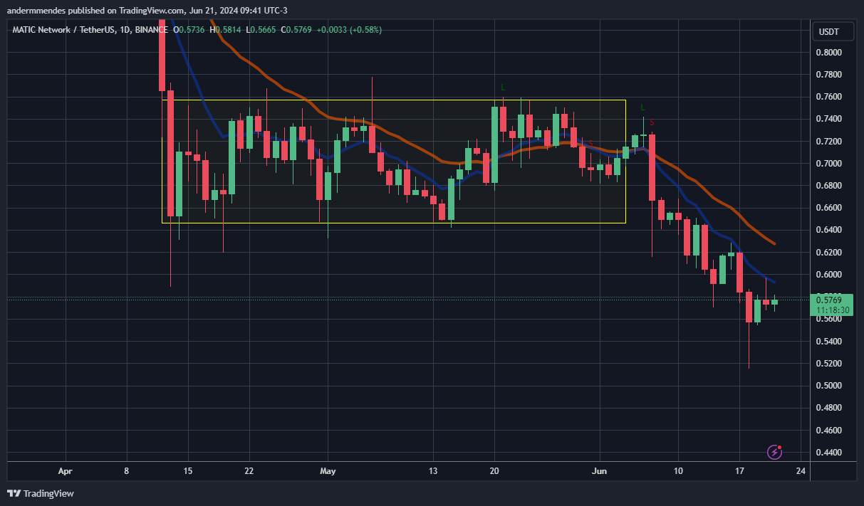 O gráfico diário mostra que a MATIC está em tendência de baixa desde que caiu abaixo de um padrão de consolidação (retângulo) em 7 de junho. Desde então, o ativo chegou a cair cera de 20%.