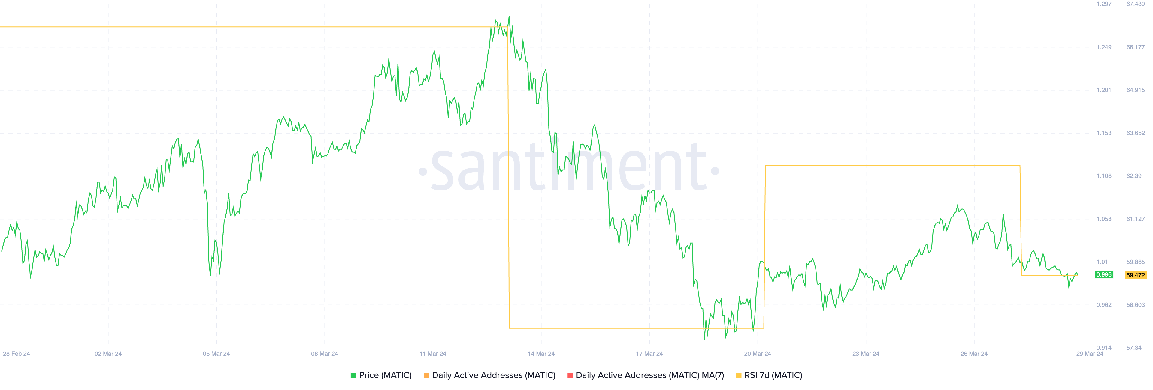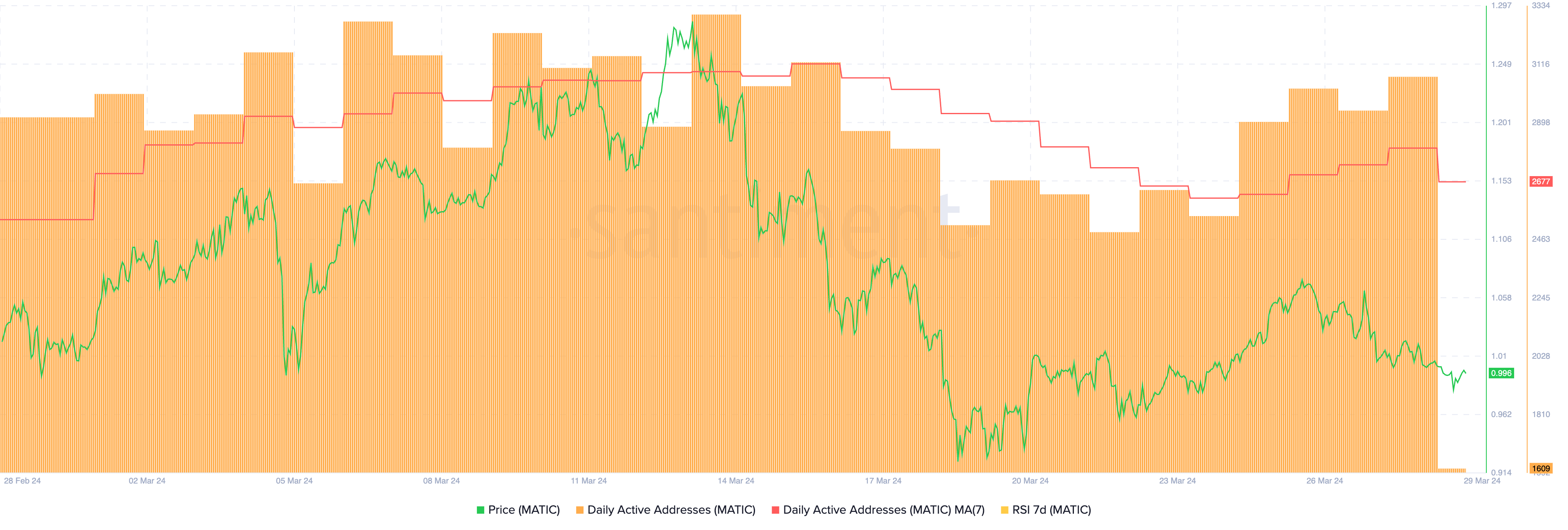 O preço da Polygon (MATIC) está ressurgindo, indicado por uma recuperação nos endereços ativos diários após declínios acentuados. Esse aumento, apoiado pelo RSI de 7 dias, sugere potencial para mais compras que poderiam aumentar o preço da MATIC.