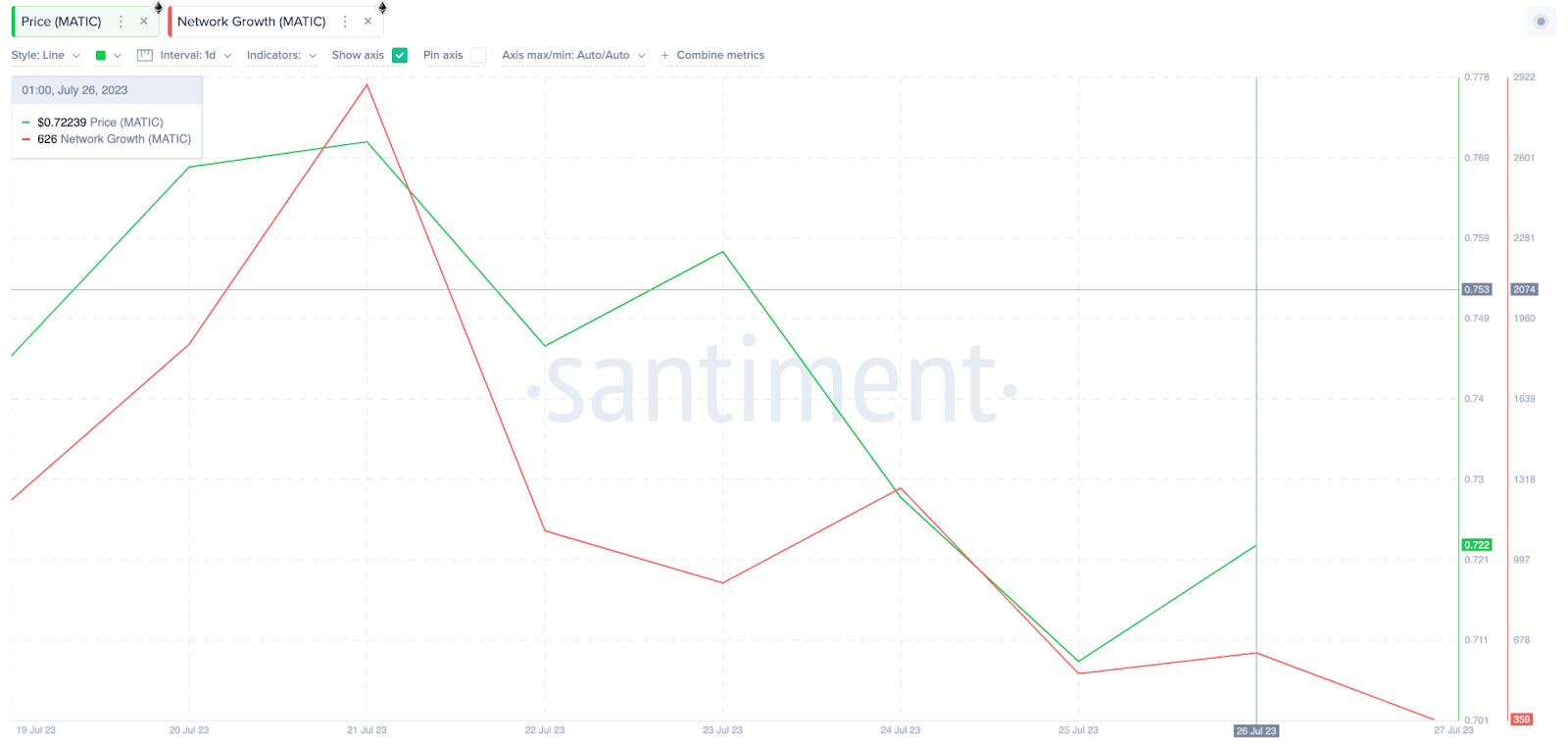 Os dados do Network Growth compilados pela Santiment mostram que, no dia 20 de julho, os investidores abriram 2.893 novos endereços de carteira MATIC. Mas, no final de 26 de julho, esse número havia caído 78%, para apenas 626 novos endereços.