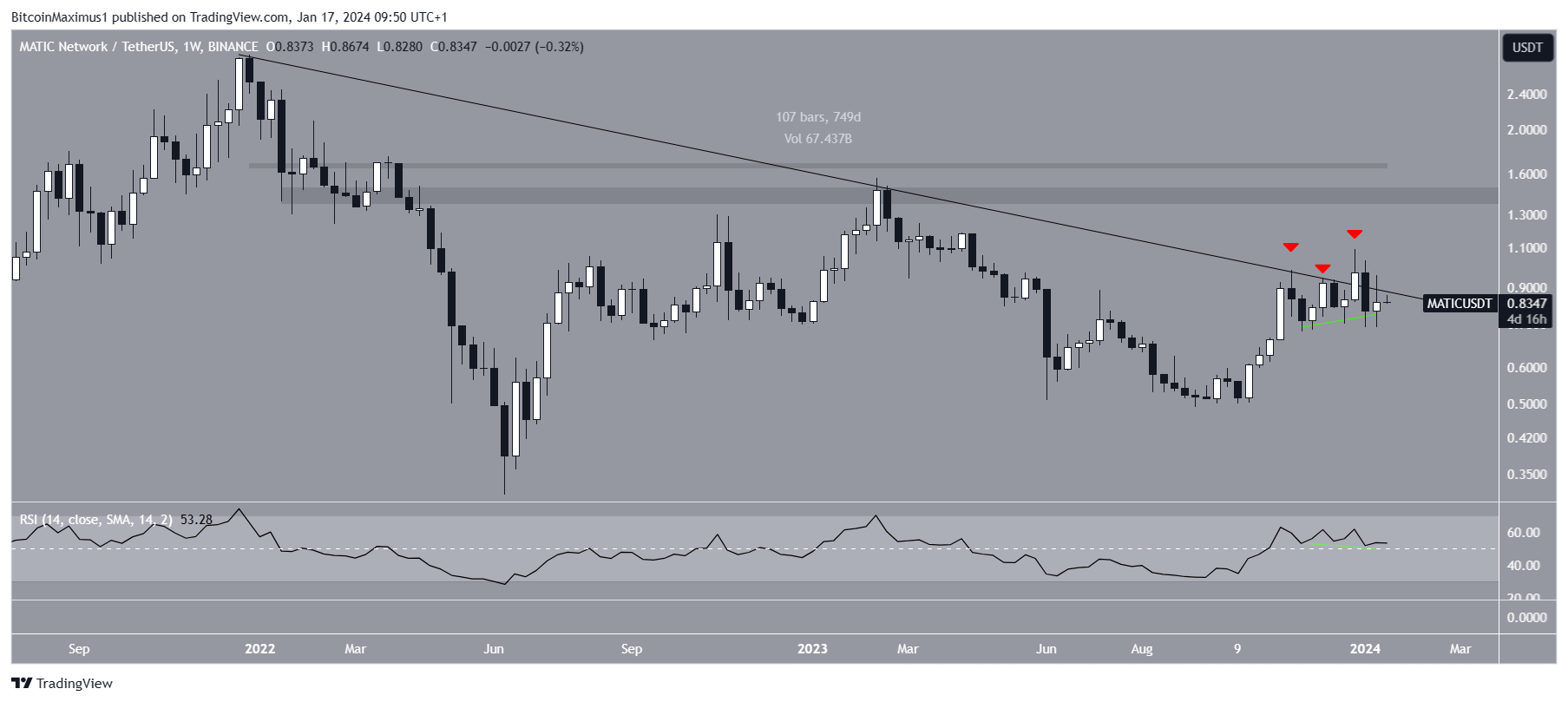Apesar disso, a MATIC não conseguiu sair da linha de tendência de baixa. Em vez disso, foi rejeitado várias vezes, as mais recentes em novembro e dezembro de 2023 (ícones vermelhos).