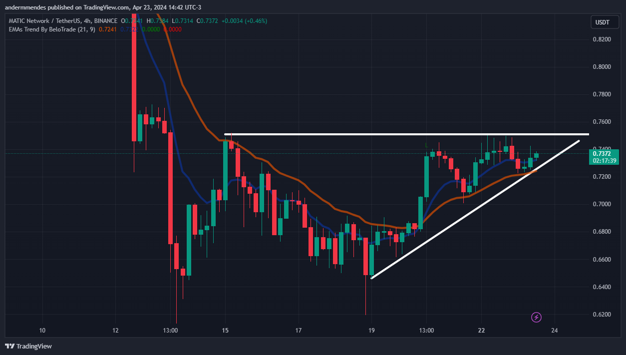 A análise do gráfico de 4 horas mostra que a MATIC entrou em tendência de alta na última sexta-feira (19). A moeda formou topos e fundos mais altos desde então.