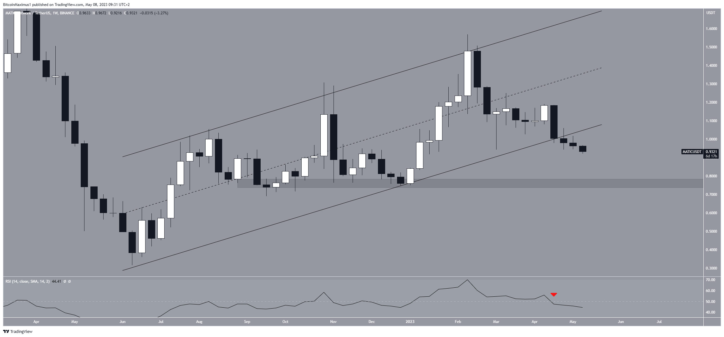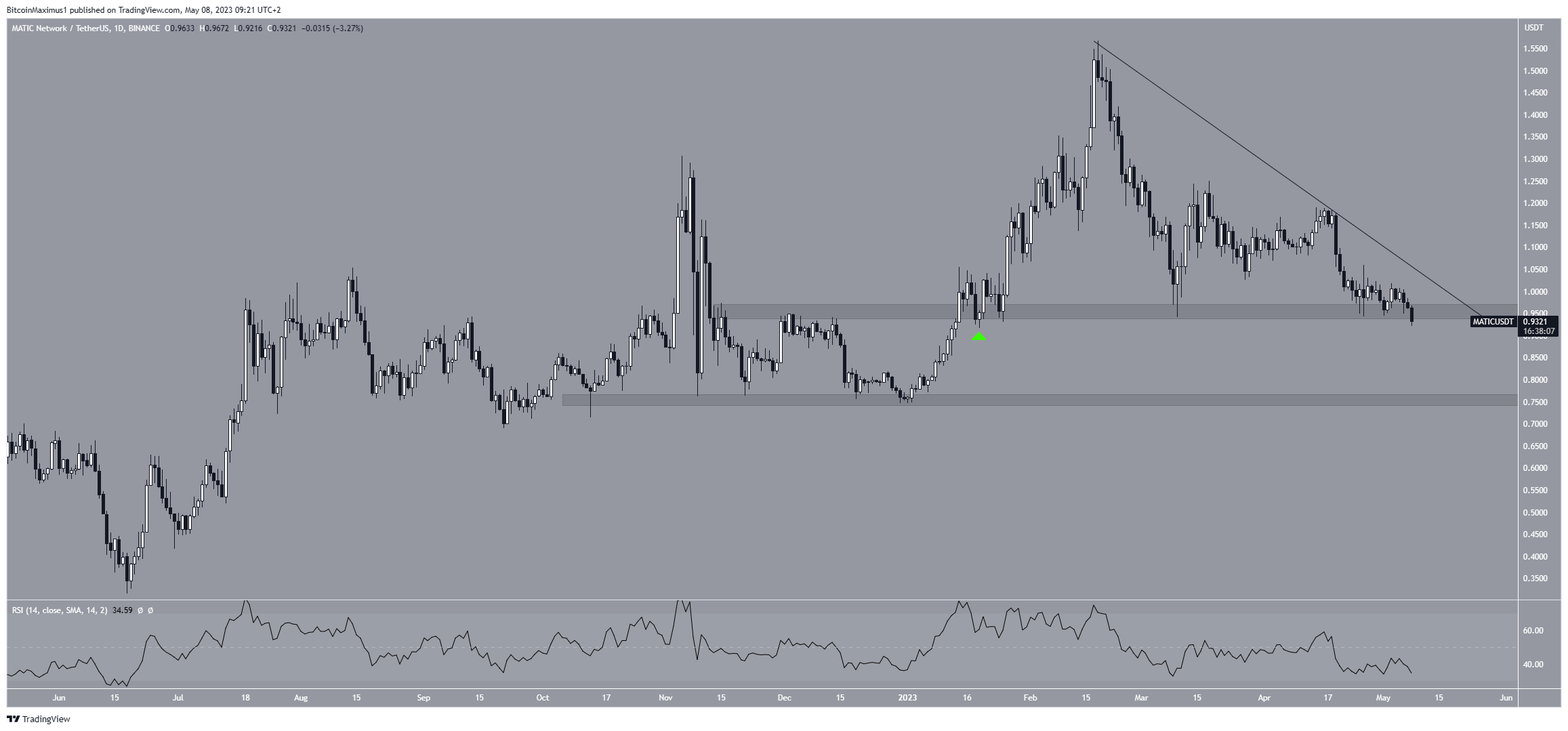 A análise de preço da Polygon no gráfico diário concorda com a perspectiva do semanal. Embora o preço inicialmente tenha saltado da área de suporte horizontal em US$ 0,95, agora está em processo de rompimento.