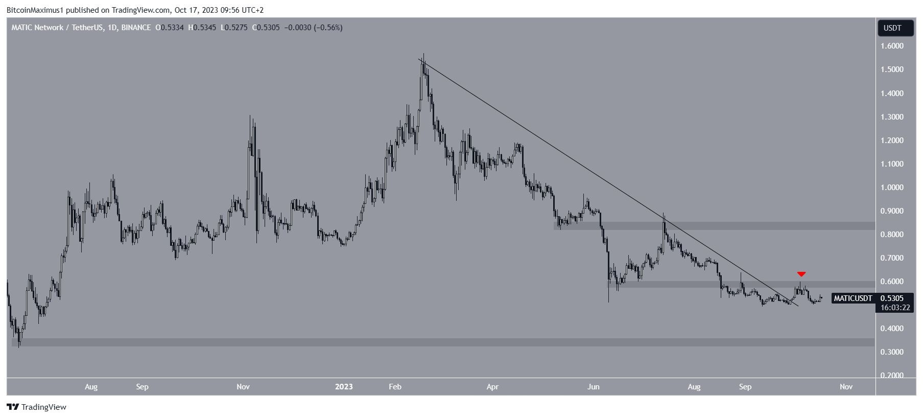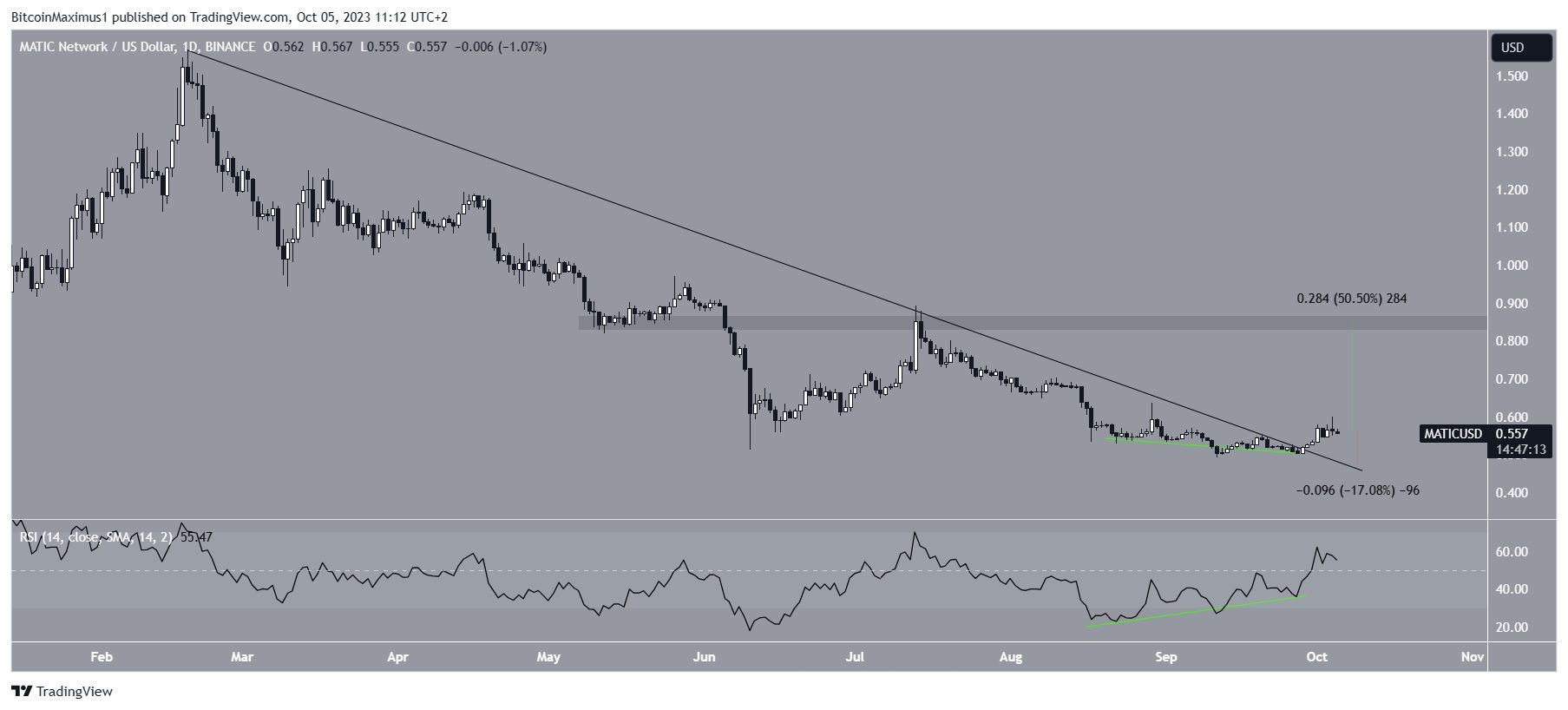 A Polygon (MATIC) saiu de uma linha de tendência de baixa de longo prazo em 29 de setembro. Apesar desse rompimento, o preço ainda está abaixo da área de resistência horizontal de US$ 0,60.