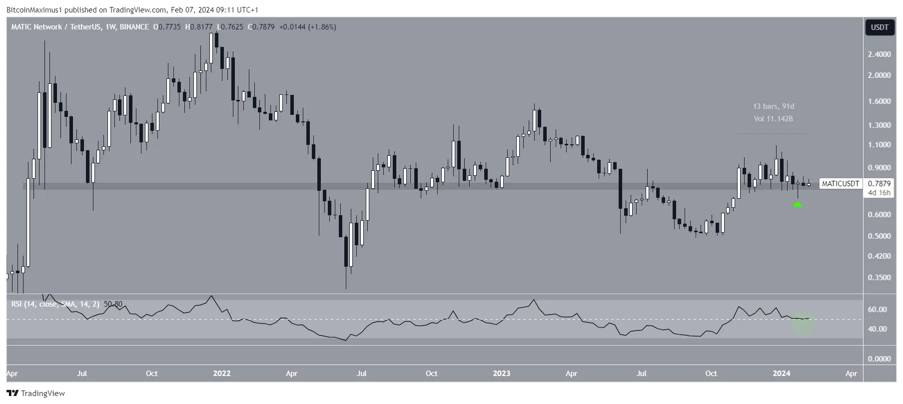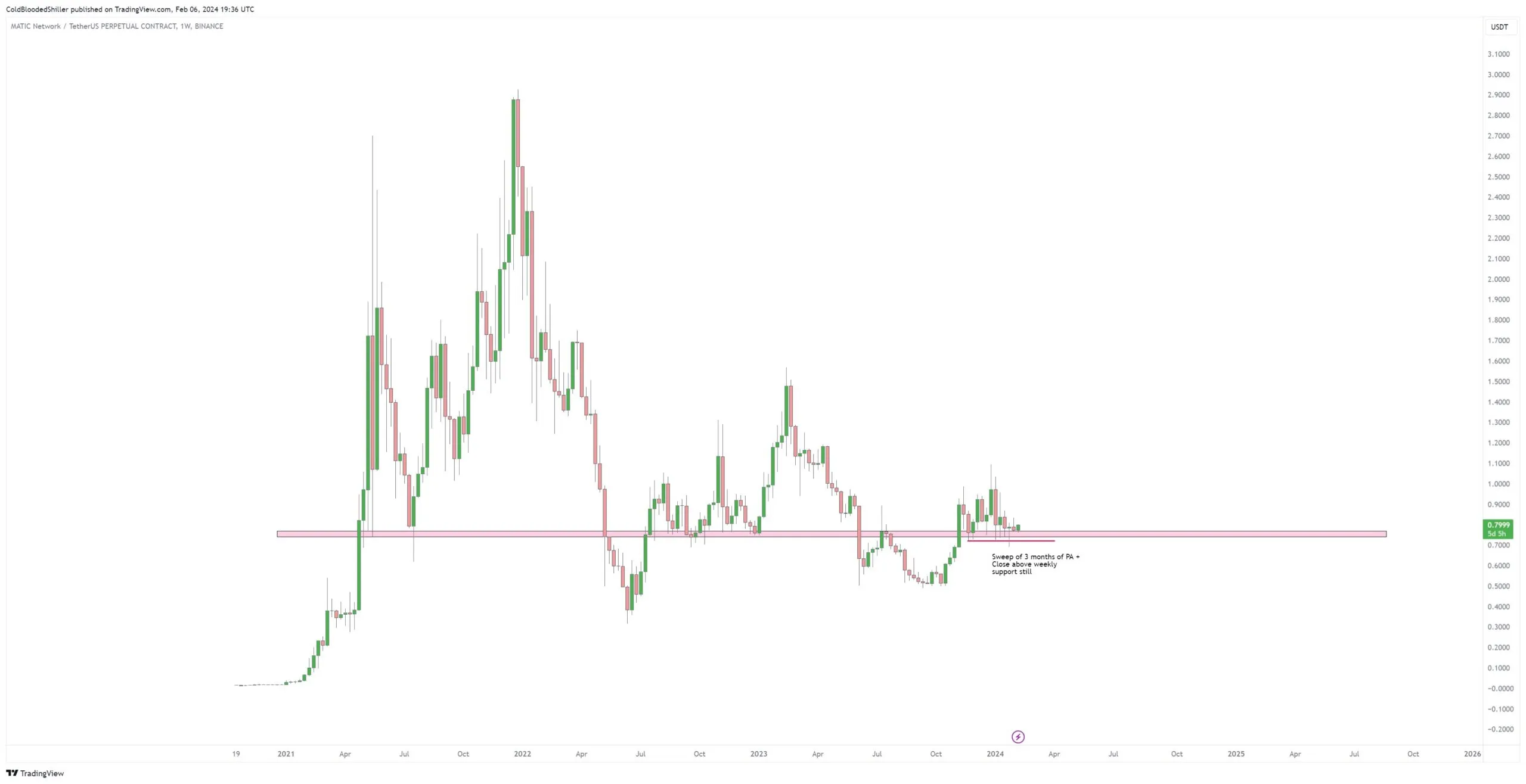 A análise técnica do gráfico semanal mostra que a MATIC está acima de uma área de suporte horizontal de longo prazo por mais de 90 dias. Essa área tem atuado intermitentemente como suporte e resistência desde abril de 2021.