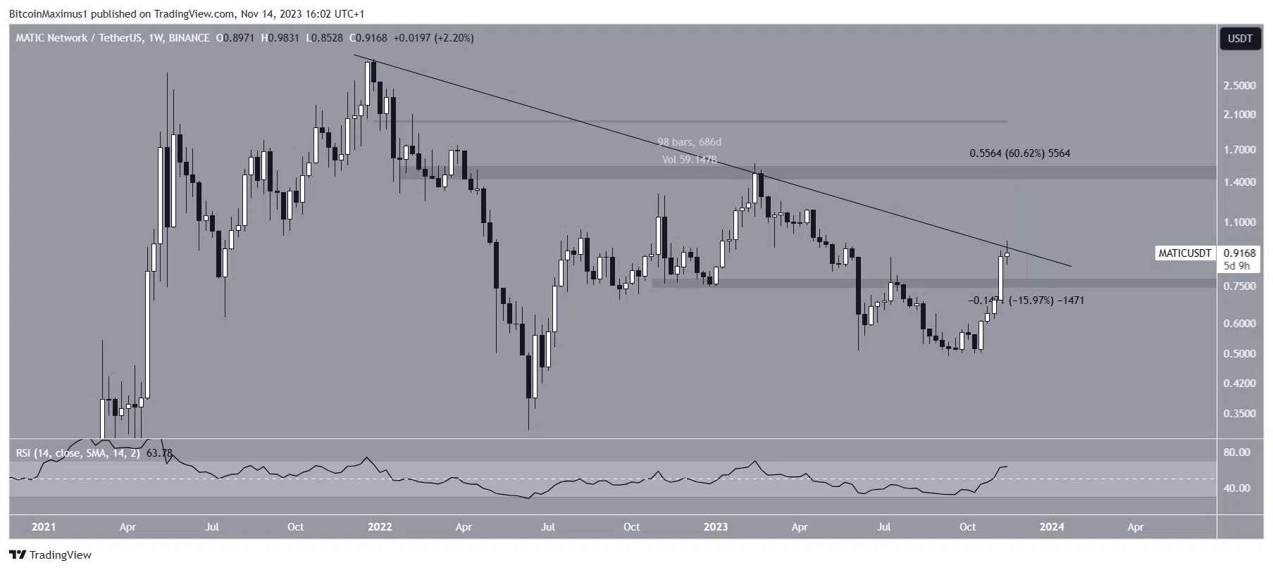 Uma análise ampliada do período semanal mostra que a Polygon segue uma linha de tendência de baixa desde que atingiu seu preço recorde em 2021. Essa linha está em vigor há quase 700 dias.