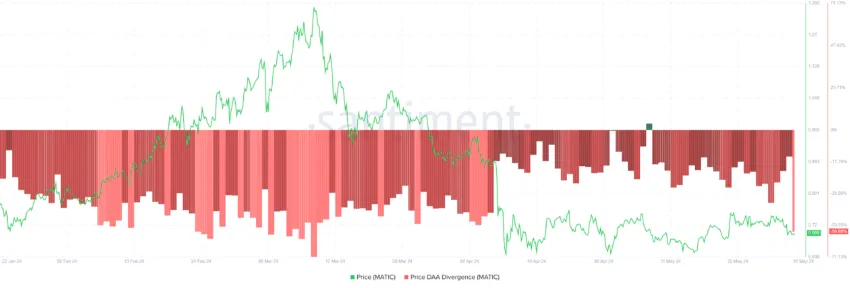 Isso é visível na divergência de preços dos endereços ativos diários (DAA). Em suma, esse é um fenômeno em que o preço de uma criptomoeda e o número de seus endereços ativos diários se movem em direções opostas. Portanto, essa divergência pode indicar uma possível supervalorização ou subvalorização.