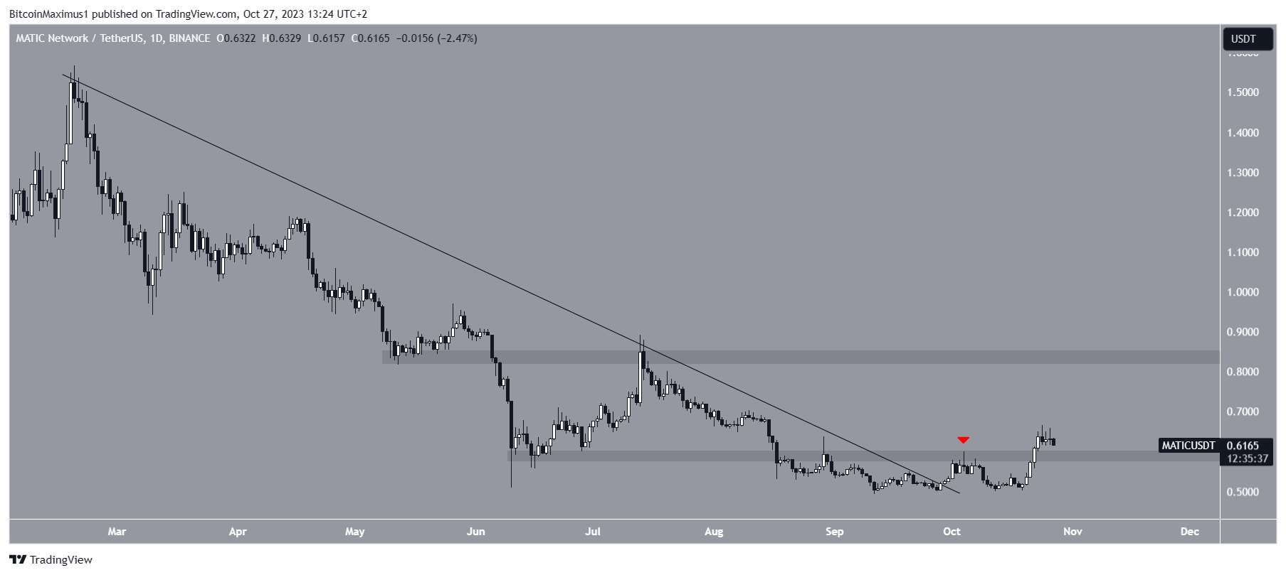 Em setembro, a MATIC caiu abaixo da área horizontal de longo prazo de US$ 0,60. No entanto, isso foi apenas um desvio (círculo verde), uma vez que o preço recuperou a área pouco depois.