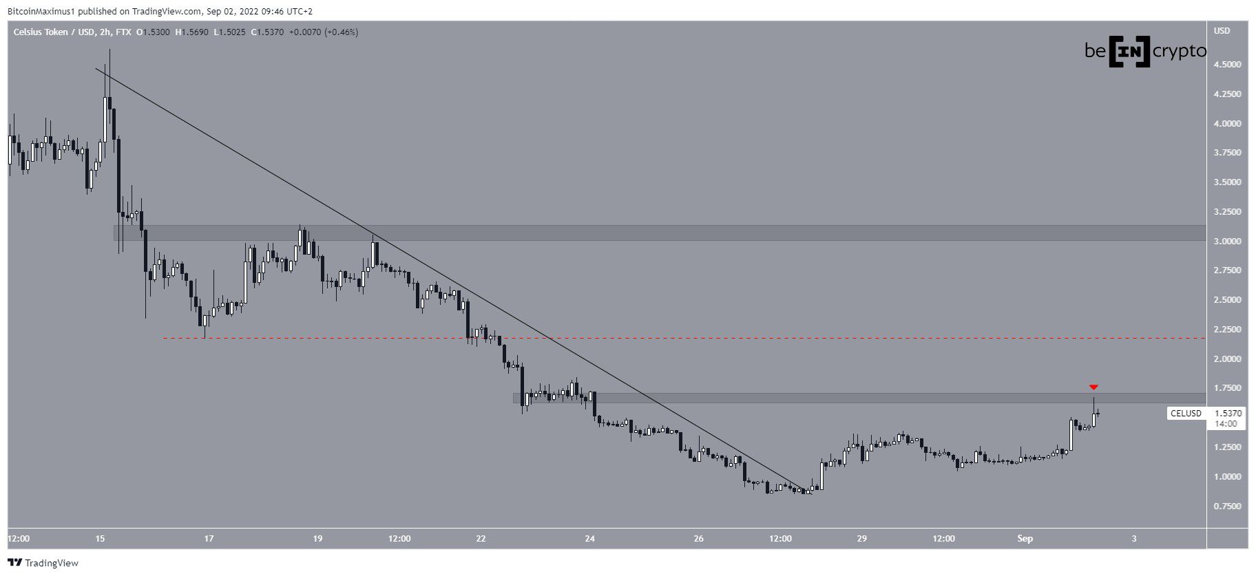 O NEXO está subindo desde 30 de junho. Em 11 de agosto, conseguiu romper uma linha de resistência descendente. Depois de validar a linha como suporte cinco dias depois, o preço acelerou sua taxa de aumento e fez uma tentativa mal sucedida de se mover acima da área de resistência horizontal de US$ 1,20.