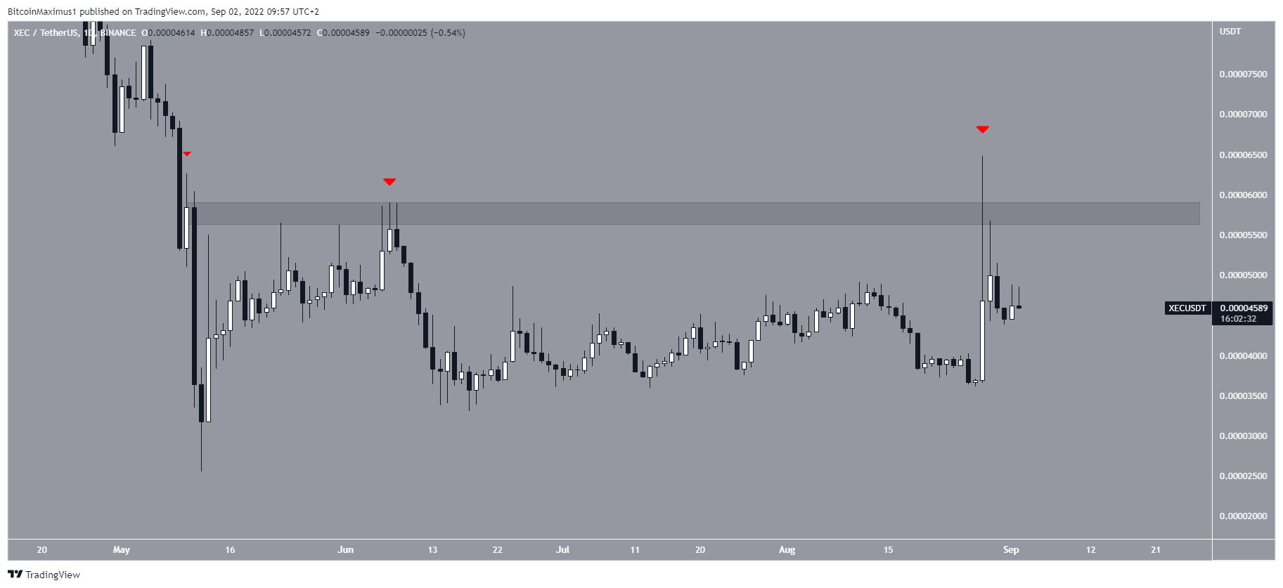 O XEC está subindo desde 12 de maio. Desde então, ele fez três tentativas de se mover acima da área de resistência de US$ 0,000057 (ícones vermelhos), todas sem sucesso.