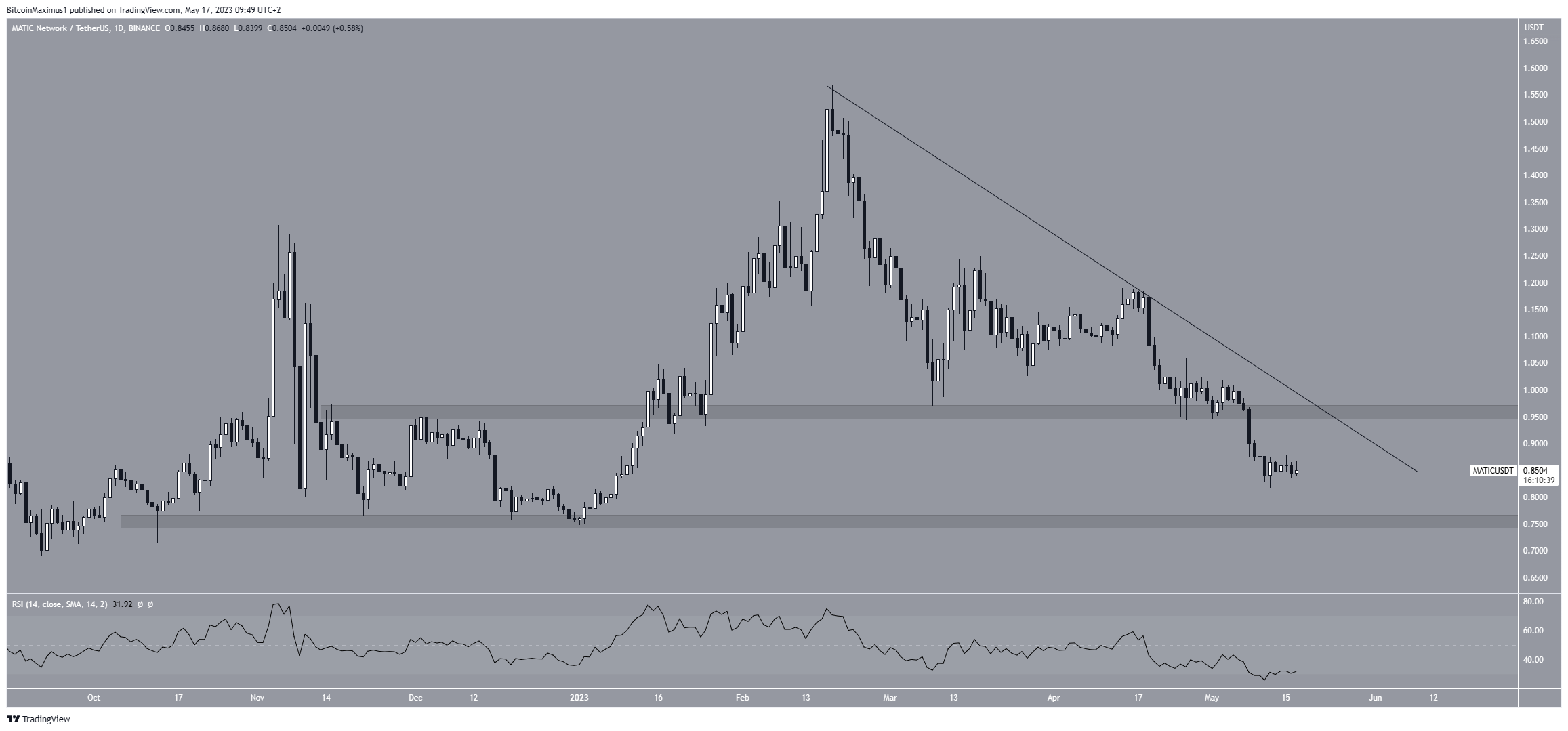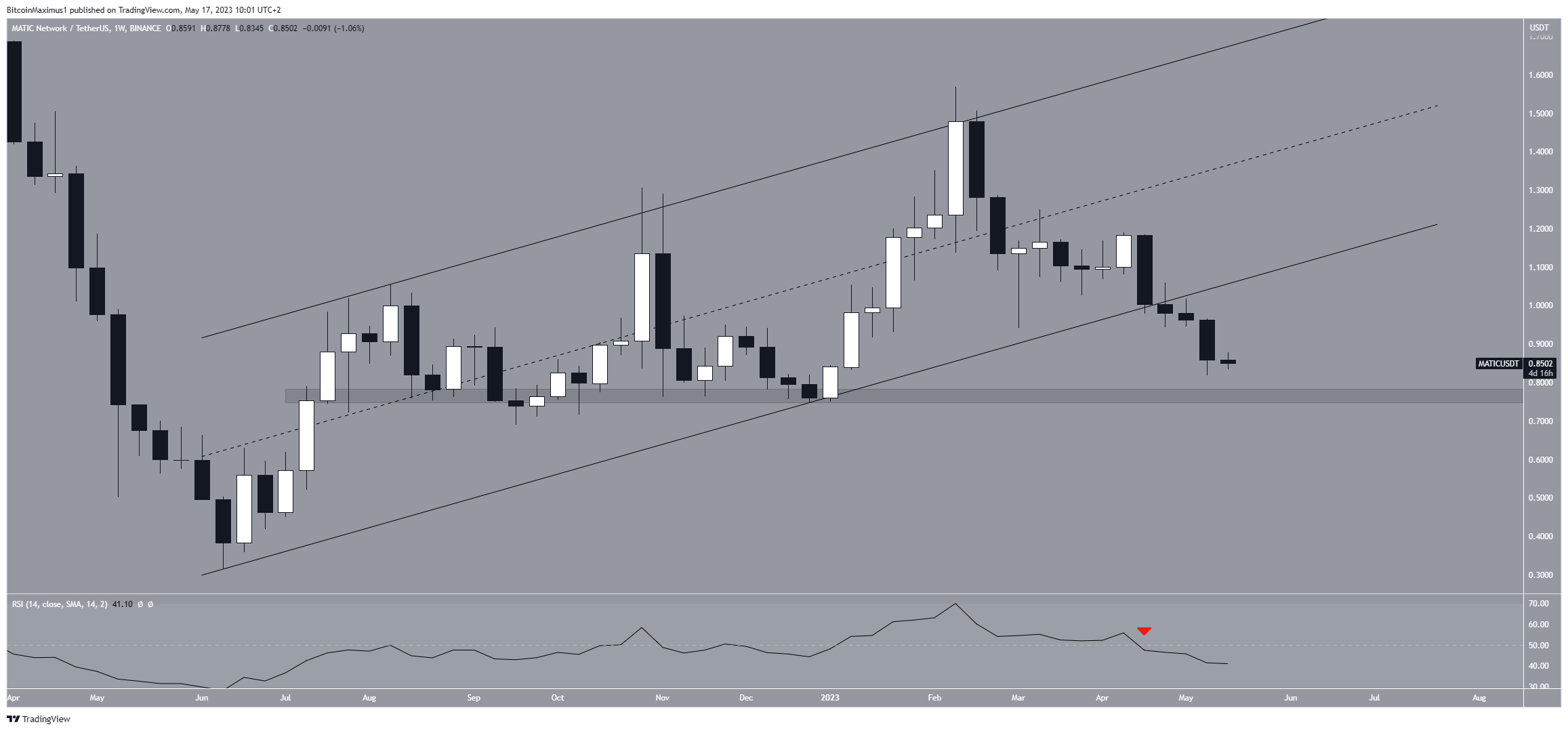 O gráfico semanal fornece uma leitura de baixa para o preço da Polygon. O token MATIC estava negociado dentro de um canal paralelo de alta de longo prazo desde julho de 2022.