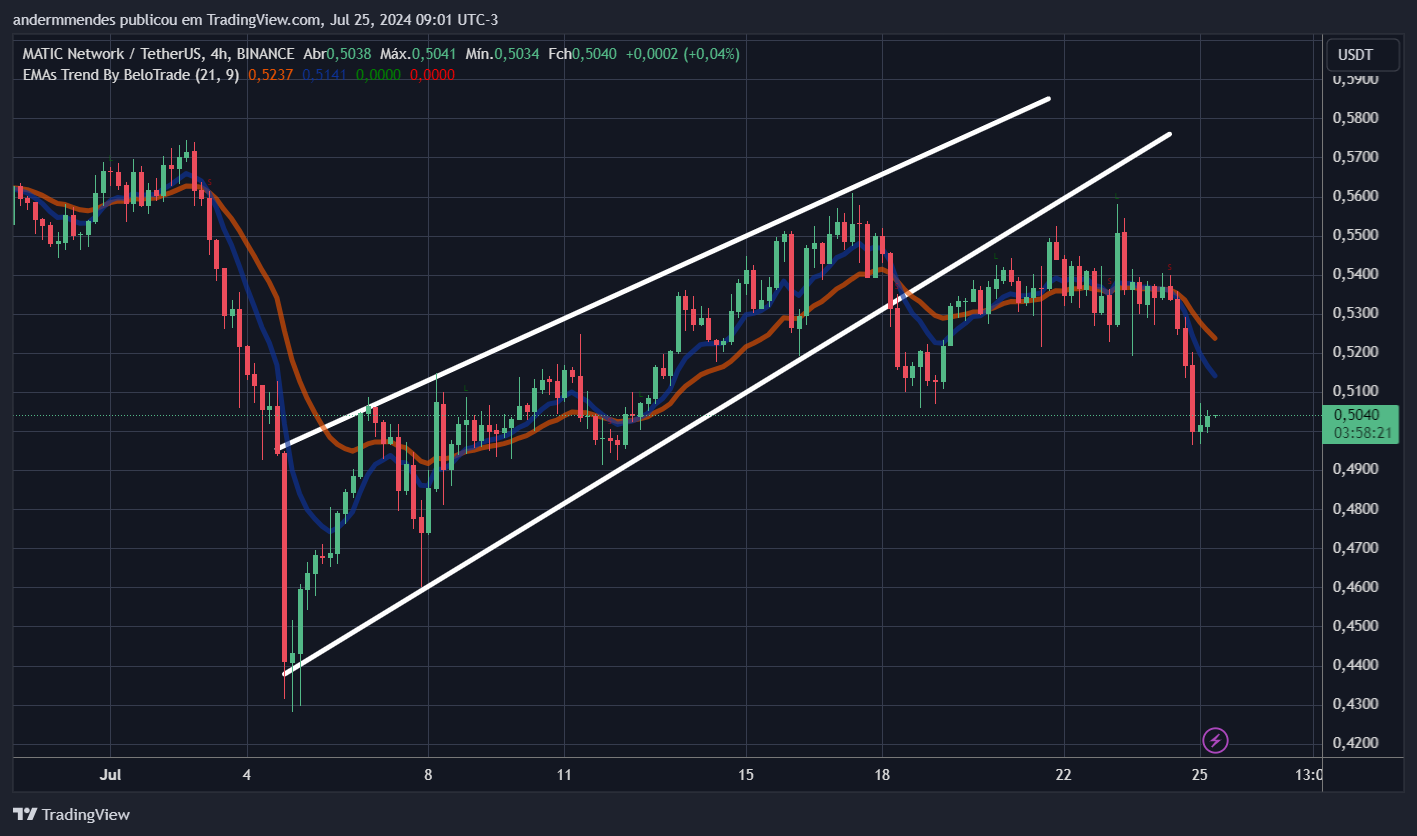 O gráfico de 4 horas mostra que a MATIC caiu recentemente após perder o nível de US$ 0,52. Esse nível de preço estava atuando como suporte em uma consolidação de curto prazo, entre os dias 19 e 24 de julho.