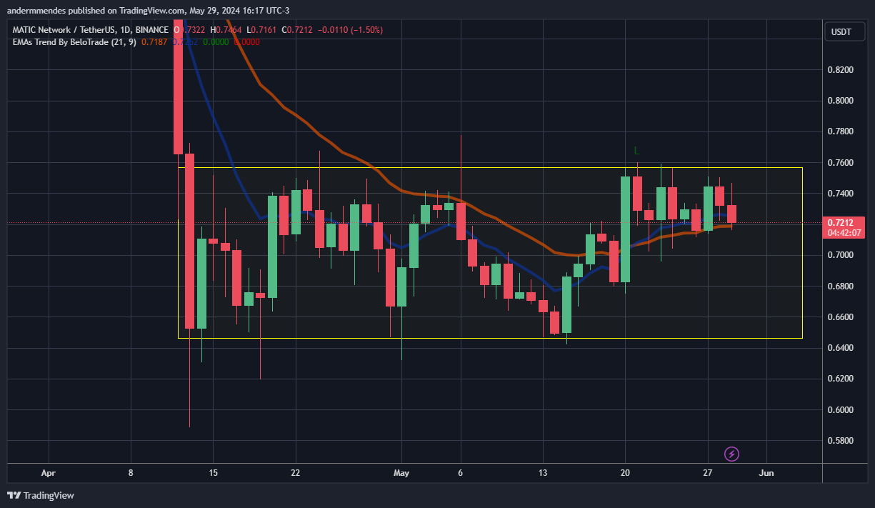 A MATIC oscila entre US$ 0,64 e US$ 0,75 desde 13 de abril, não formando corpos de candles diários acima ou abaixo dessa faixa de preço. Isso fez com que a altcoin perdesse protagonismo em relação a outras criptomoedas, ficando fora da lista das 20 maiores em valor de mercado.