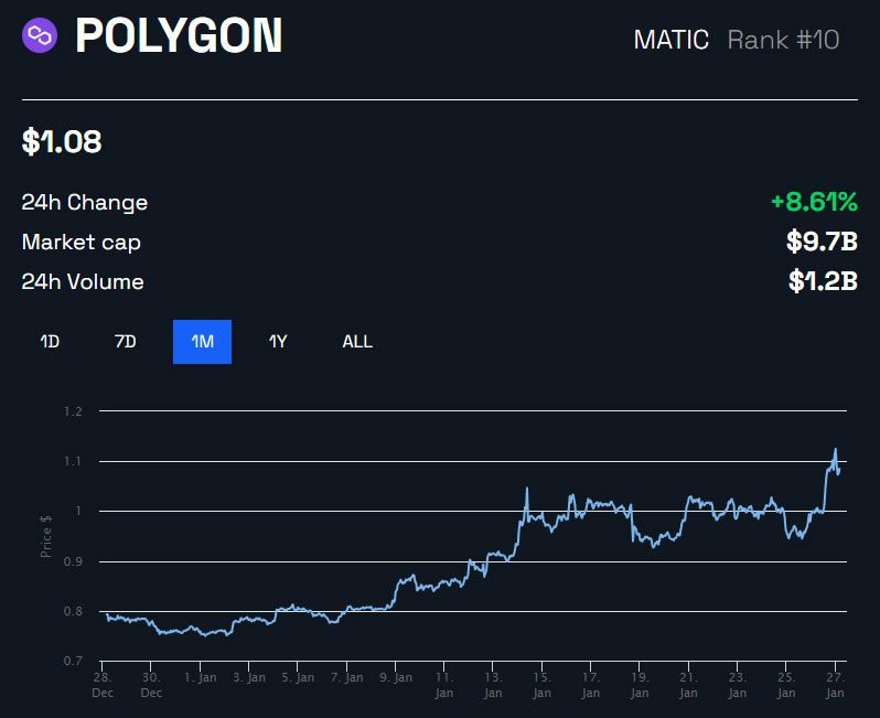 O salto de atividade on-chain se refletiu no preço da MATIC. Como resultado, a moeda subiu 8,7% no dia, chegando a US$ 1,09 no fechamento da matéria. Notavelmente, a MATIC está se movendo na direção oposta ao resto do mercado de criptomoedas, que está em queda.