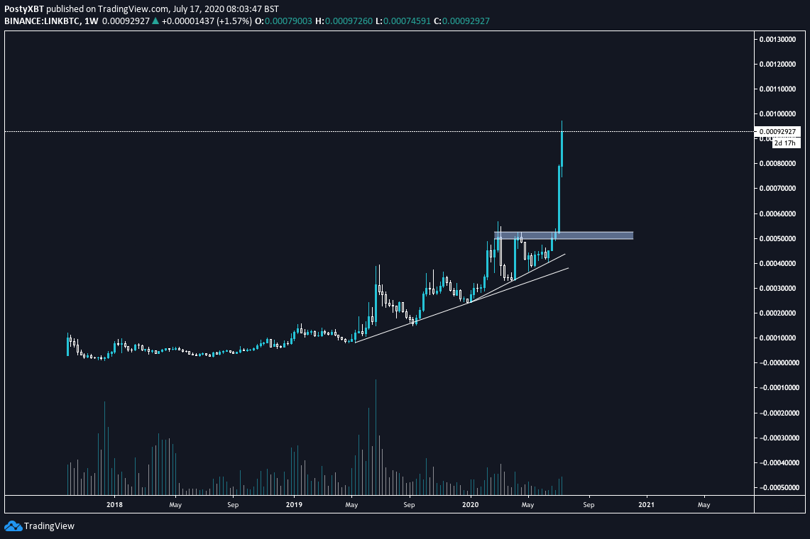 O preço da Chainlink (LINK) está subindo desde 13 de março. Em 6 de julho, o preço rompeu em relação à máxima anterior de todos os tempos e subiu a um ritmo acelerado.