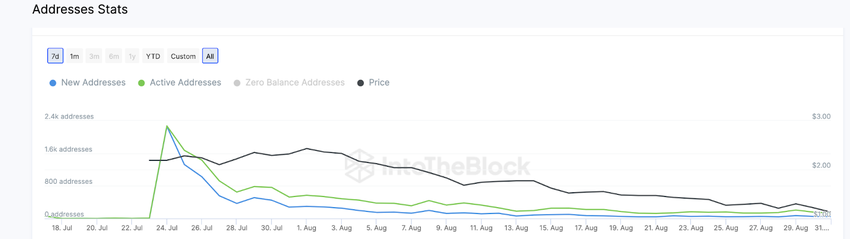De acordo com o gráfico do IntoTheBlock, a Worldcoin começou forte com 2.270 endereços ativos realizando transações no dia 24 de julho. No entanto, no dia 31 de agosto, esse número diminuiu para apenas 137 endereços de carteira ativa.