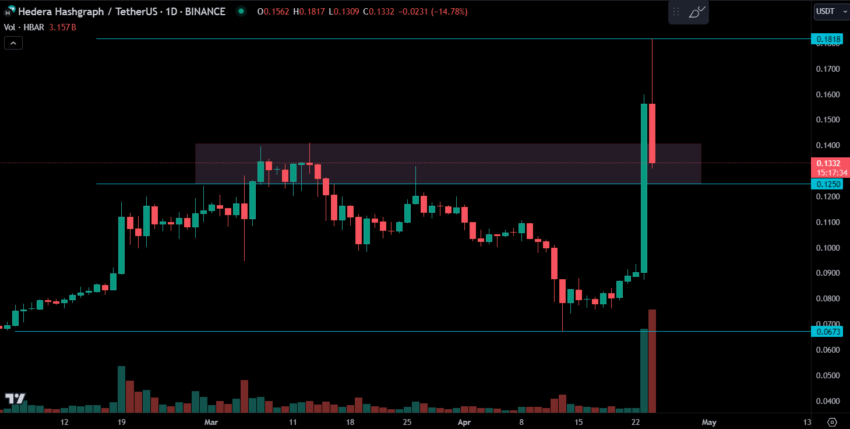 Após o anúncio, a HBAR registrou um impressionante aumento de 100% no preço. O toke atingiu uma alta de US$ 0,18, seu maior valor em dois anos, antes de entrar em correção. Atualmente, o preço está em um ganho de 57% no dia.
