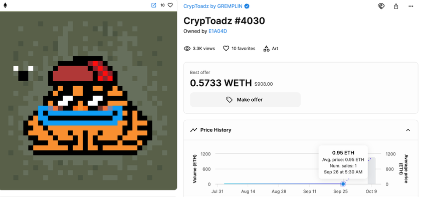 Os dados da OpenSea mostram que a carteira 0xe1a0 comprou o CrypToadz #4030 por 1.055 WETH (cerca de US$ 1,4 milhão) no dia 9 de outubro. Isto chamou a atenção da comunidade porque o preço médio daquele NFT girava em torno de 0,95 ETH.